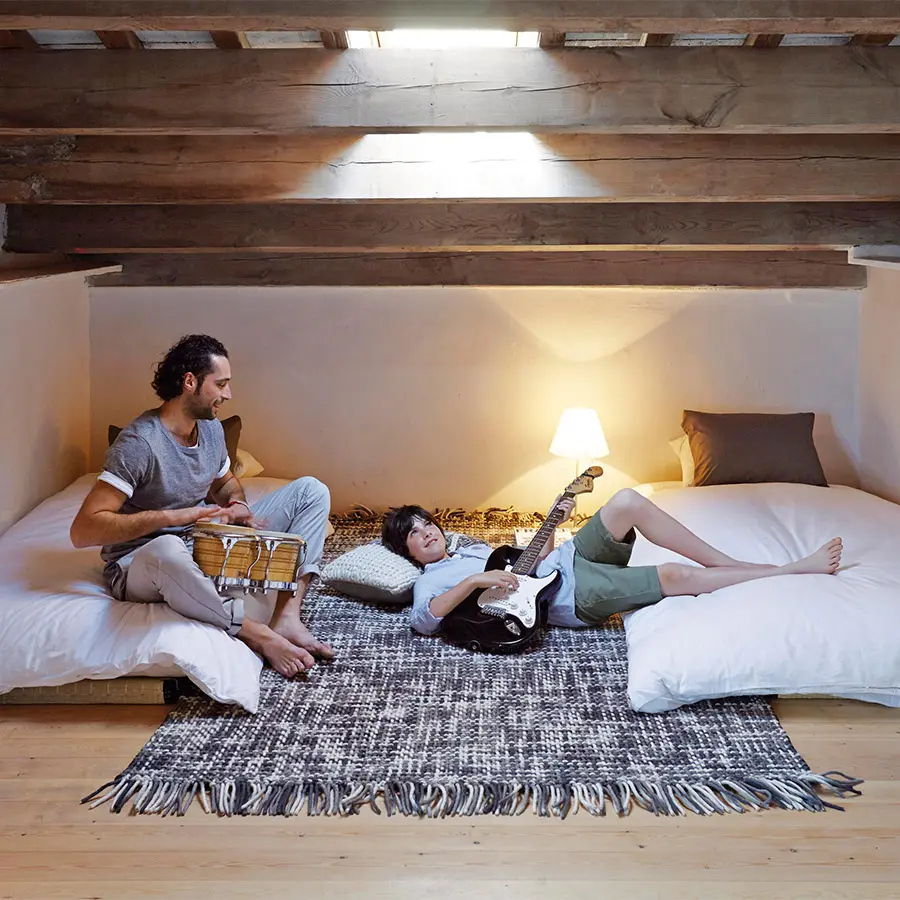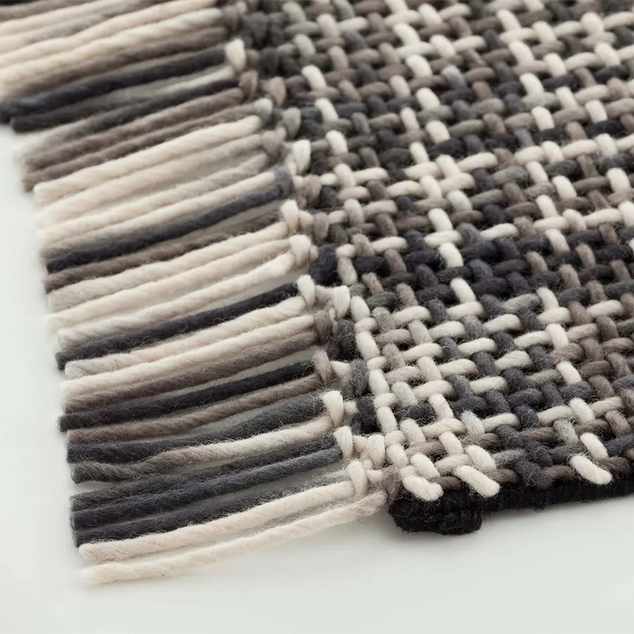 El entramado de nuestra alfombra Lama se elabora con gruesos hilos de lana teñidos con la técnica tie- dye, un sistema en el que se emplean nudos a la hora de teñir un textil y que, en este caso, ha sido aplicado individualmente a las hebras. Esta técnica produce transiciones de color a modo de degradados entre los tonos usados, peculiaridad que se aprecia especialmente en los flecos de Lama.