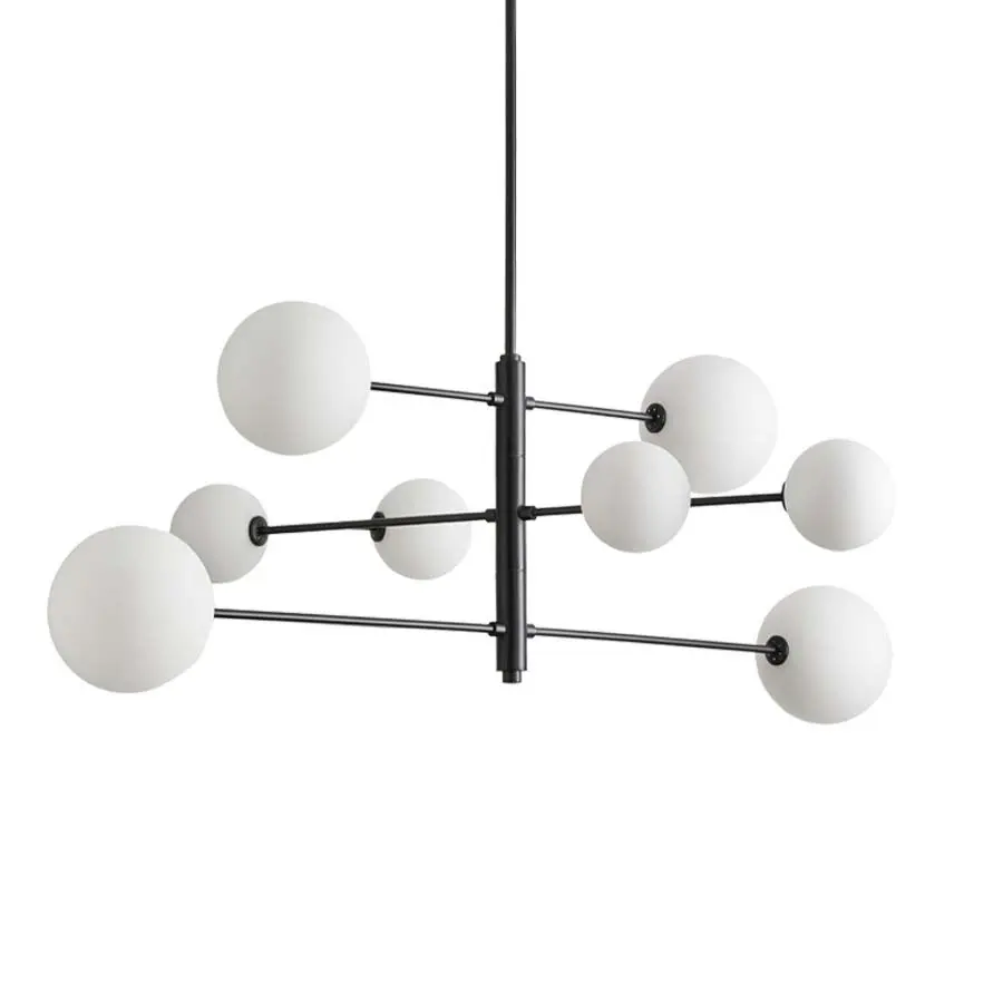 La lámpara Atom, diseñada por AC Studio, brinda luz y elegancia al hogares. La disposición de las ocho pantallas de vidrio opal evoca el movimiento de partículas elementales, lo que se suma a la estética moderna de la pieza. Las pantallas están suspendidas sobre una estructura de metal, lo que hace que la lámpara sea discreta y minimalista, acentuando la forma simple de globo de las pantallas.