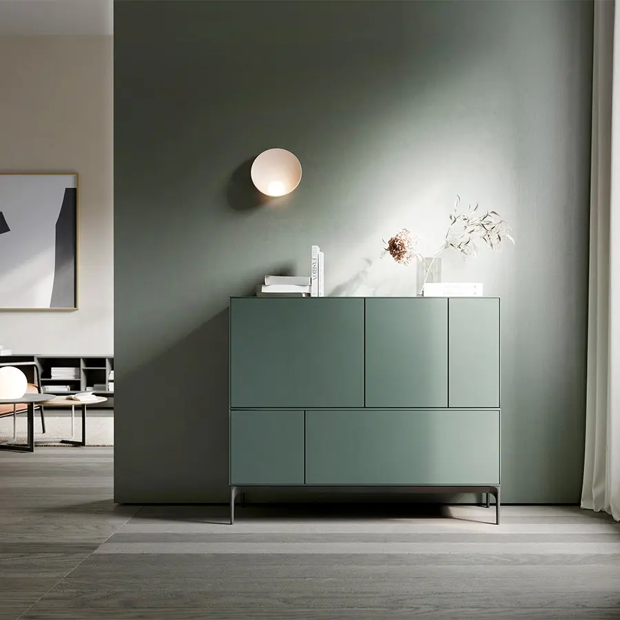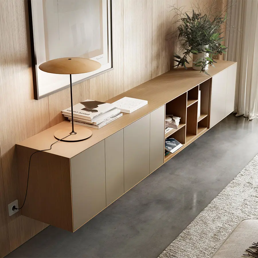La colección Lauki está compuesta de múltiples cajas que se pueden colocar en el suelo, apilar entre ellas y colgar a la pared. Además, se ofrecen en una gran cantidad de medidas, acabados y funciones (cajones, puertas, módulos abiertos…). Todo ello permite crear infinidad de configuraciones válidas para cualquier estancia. Por ejemplo, un solo módulo puede ser utilizado como mesilla al lado de una cama o como cajonera para una oficina. Con unos pocos módulos podemos configurar una solución para el recibidor o cualquier otro rincón de la casa. Y con varios módulos podemos configurar un mueble para la televisión, un aparador e incluso una cómoda para la oficina.