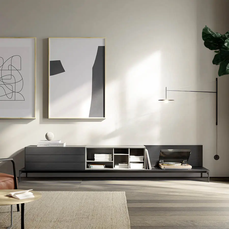 Mueble de TV de la colección Lauki diseñada por Ibon Arrizabalaga. Minimalista y elegante, el color oscuro dará un toque de sobriedad y sofisticación a la sala. Compuesto por dos módulos con puertas y cajones sin tiradores con apertura push to open para una apariencia más sencilla y limpia.