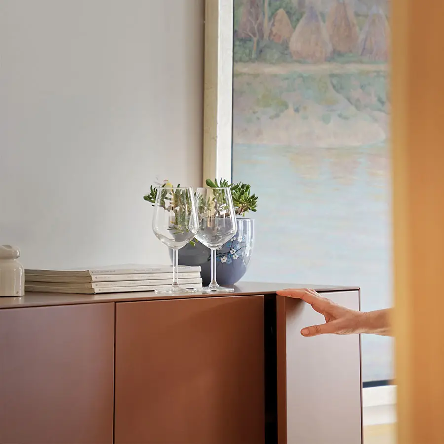 Mueble de TV de la colección Lauki diseñada por Ibon Arrizabalaga. Este diseño optimiza la capacidad de almacenaje del mueble, con 4 puertas asimétricas sin tiradores, apoyadas sobre un bastidor con pies elípticos todo lacado en color teja.
