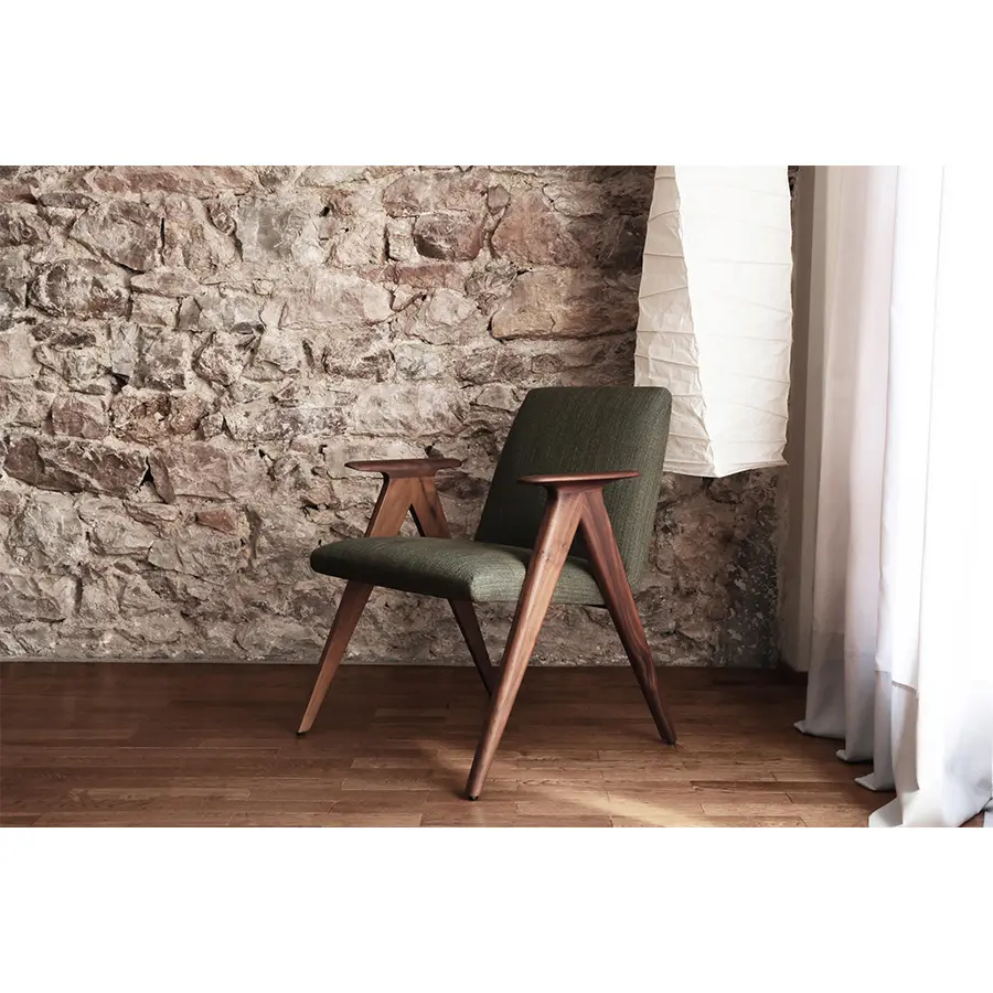 La personalidad de esta butaca proviene de sus patas de madera maciza y la forma fluida en la que éstas se funden con los brazos. Un diseño en el que la madera es tratada como si fuese un líquido, con la utilización de las últimas tecnologías, que consiguen superficies orgánicas y sensuales.