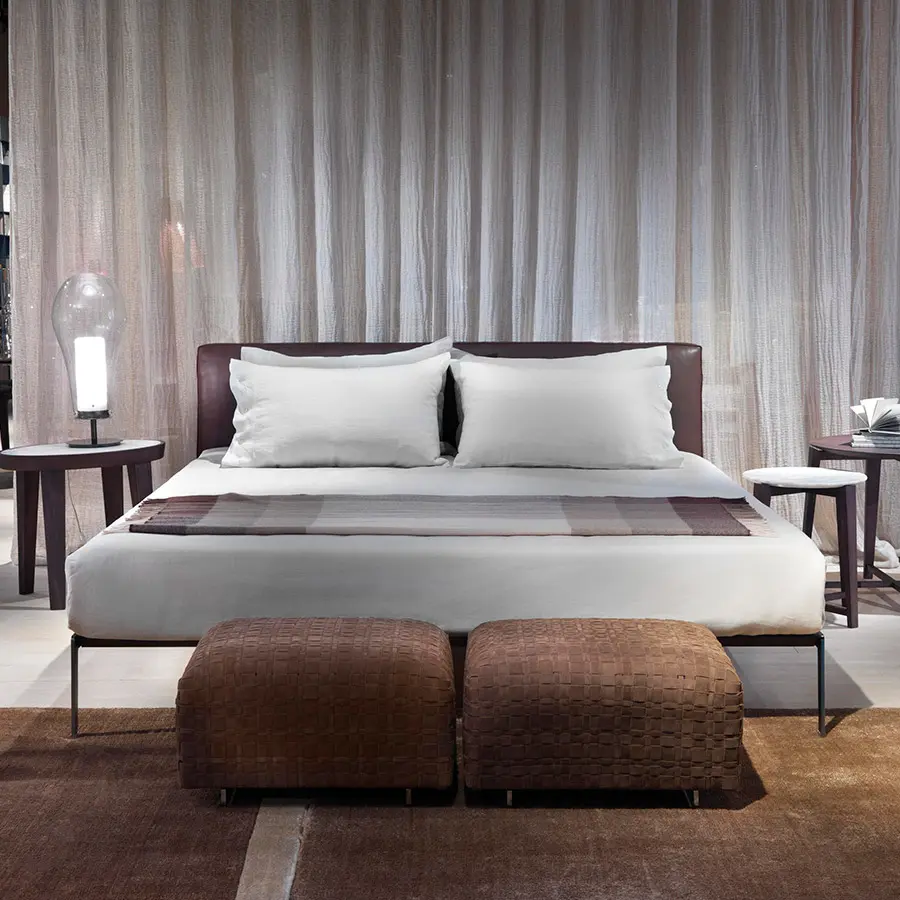 Lifesteel es una cama caracterizada por una estética esencial y ligera, pero generosa y acogedora en sus proporciones. Se eleva del suelo a través de unas esenciales patas de metal disponibles en los acabados satinado, cromado, bruñido, cromado negro y champán, la cama Lifesteel se distingue por un refinado somier revestido de cuero, fabricado en todos los colores de la gama Flexform. Para proporcionar un soporte ideal, las almohadas del cabezal tienen un acolchado generoso en poliuretano y dacrón, recubierto con un forro protector de tela. El cabezal se puede tapizar con tela o cuero, es completamente desenfundable y se caracteriza por unos perfiles de grosgrain que pueden ser en tonos lisos o de colores en contraste.