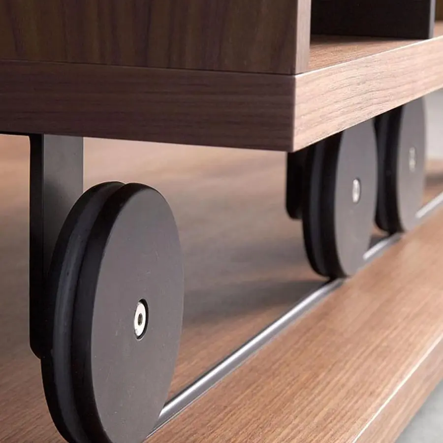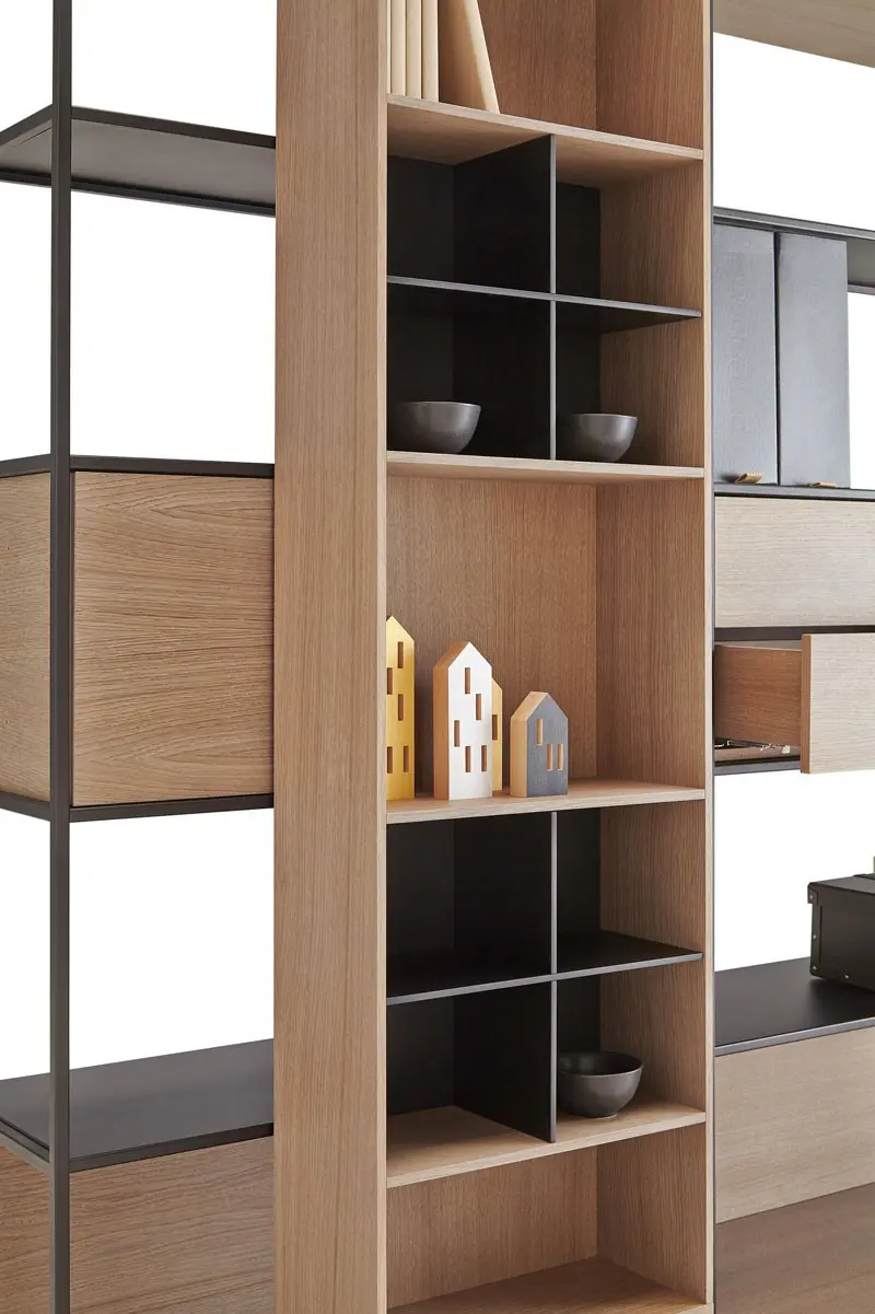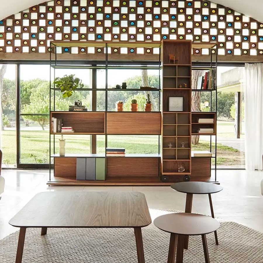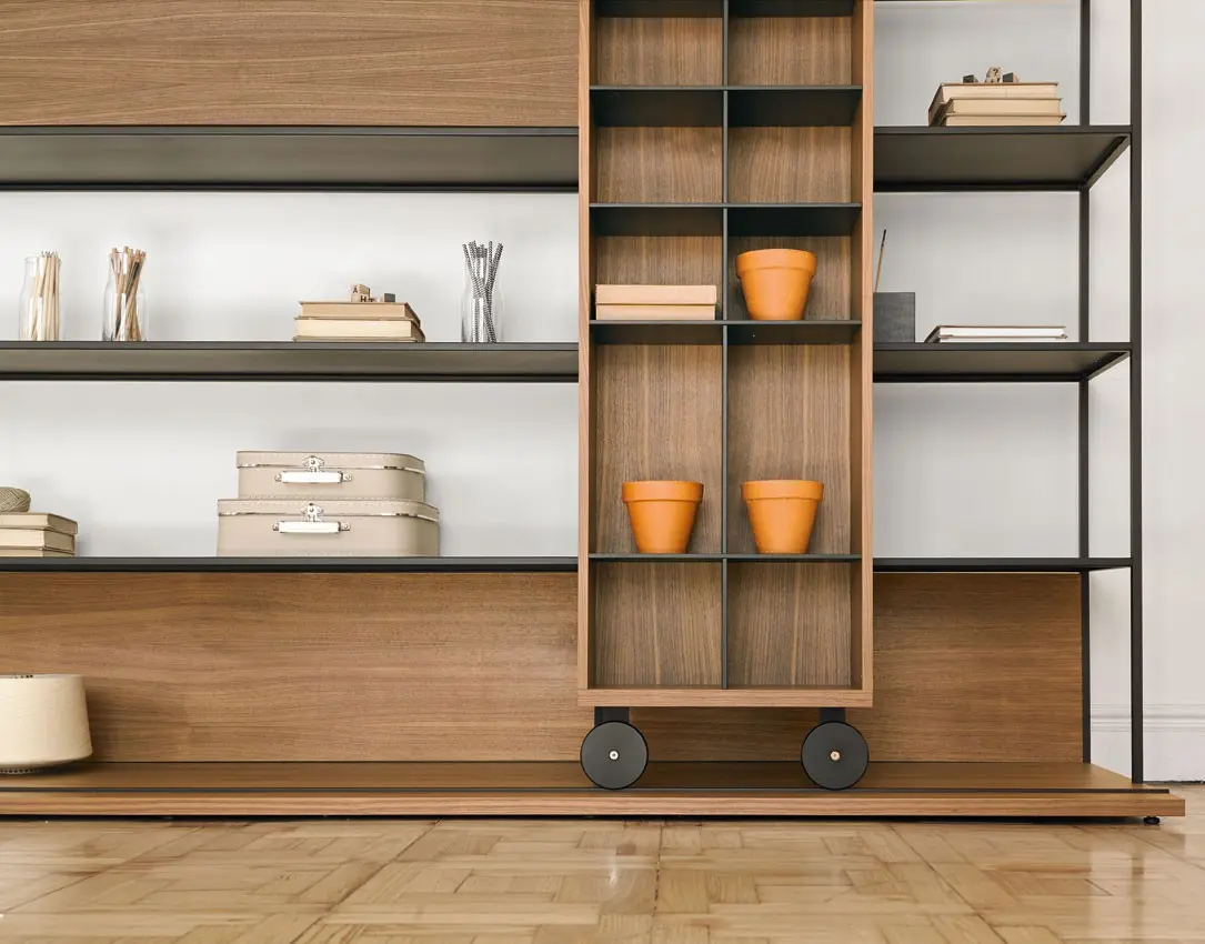 Colección de estanterías con carros, estanterías, aparadores y muebles de televisión inspirados en la clásica y mítica estantería “La Literatura” diseñada en 1985 y ganadora de premios y distinciones como la selección ADI FAD del 1986. Exhibida en Museos y con una contribución indiscutible a la obtención por punt del Premio Nacional de Diseño en 1997. Catalogada como un clásico contemporáneo desde el año 1997. Su inconfundible carro sobre ruedas ha servido durante décadas para almacenar infinidad de libros, así como acoger la era digital e integrarse con equilibrio, belleza y emoción en todo tipo de arquitectura e interiorismo. En esta versión, la OPEN, diseñada en el 2014, los volúmenes se vuelven transparentes y todavía más ligeros, a la vez que se pueden incorporar contenedores y abriéndose la posibilidad de generar divisiones de ambientes. Estantes fijos. Base con pies regulables.