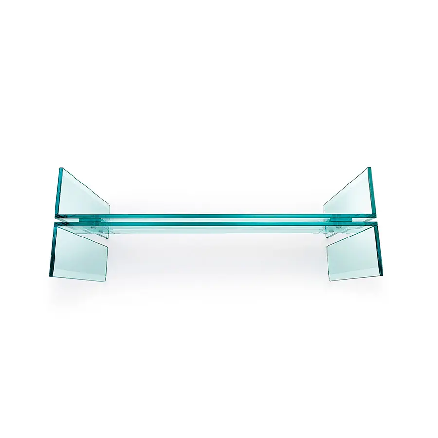 Mesa compuesta por una tapa de vidrio transparente de 15 o 19 mm de espesor con bordes biselados en los dos lados más cortos y una base de vidrio soldado transparente de 15 o 19 mm de espesor con borde biselado. Elementos de fijación en acero inoxidable. La tabla LLT puede equiparse con dos o tres bases dependiendo de la longitud superior. La mesa LLT también está disponible con un tamaño personalizado de hasta 360×100 cm.