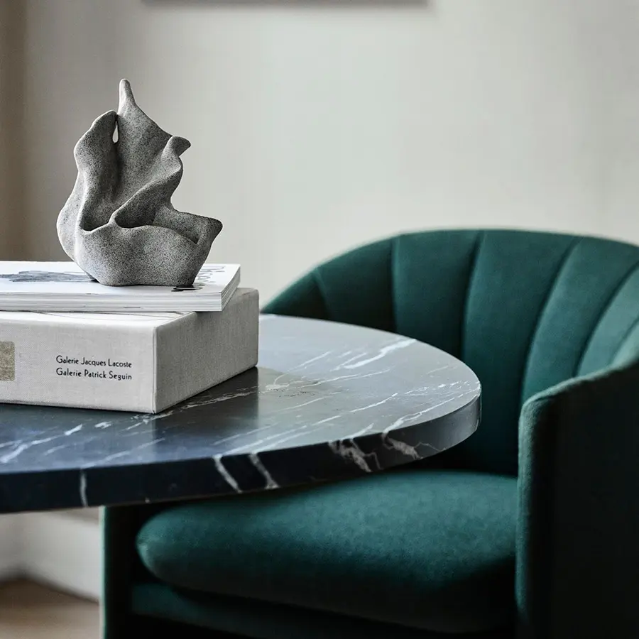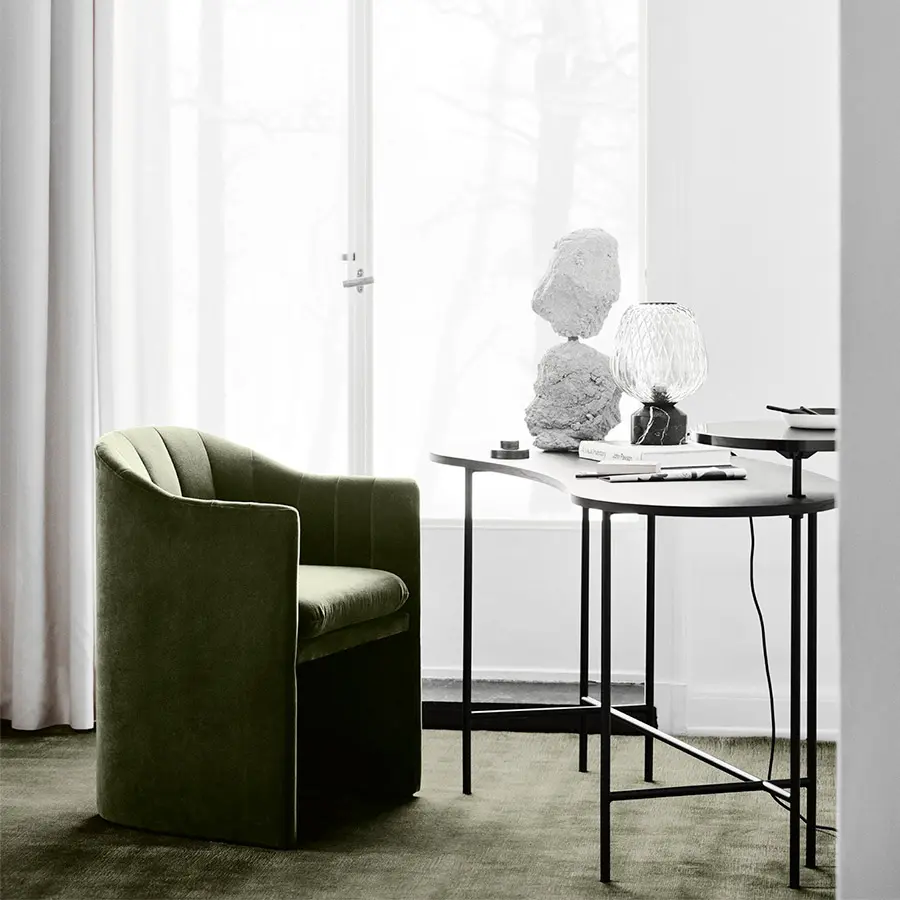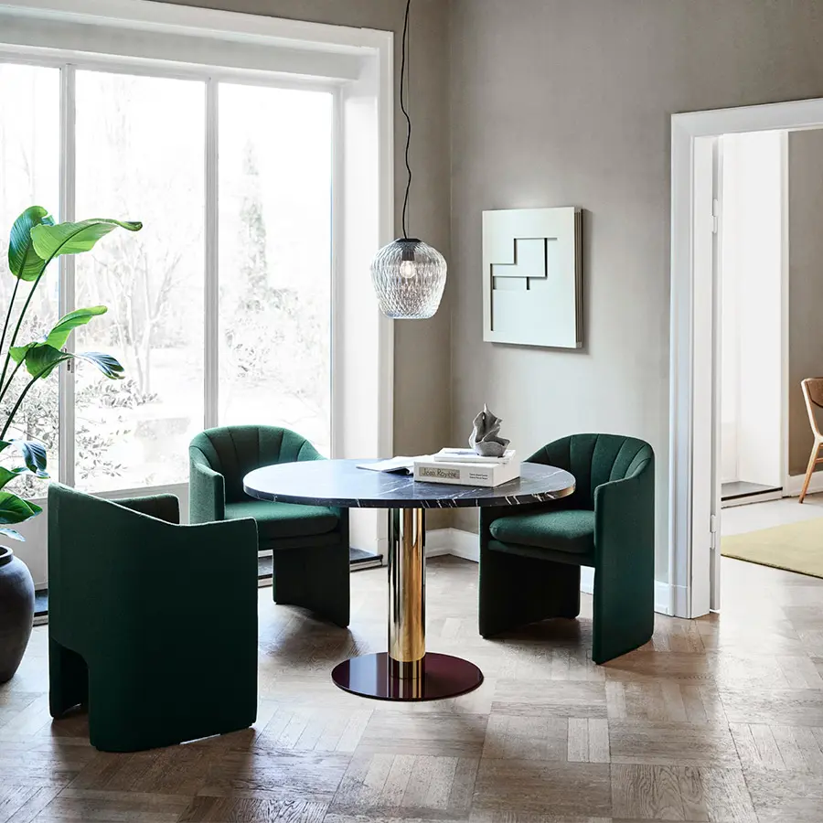 Su versión sillón fué diseñado para el lobby del icónico Hotel SAS Royal en Copenhague para crear una sensación acogedora de intimidad y relajación en espacios abiertos y concurridos. El hermoso respaldo festoneado se inspira en la escalera de caracol del hotel y las grandes columnas circulares, enfatizando su silueta impresionante, limpia y lineal. Ya sea que se utilice como una gran silla de salón en una sala de estar o en un hotel o restaurante,nrepresenta elegancia y sofisticación lujosas.