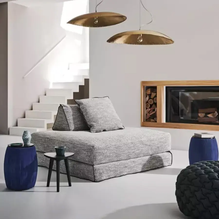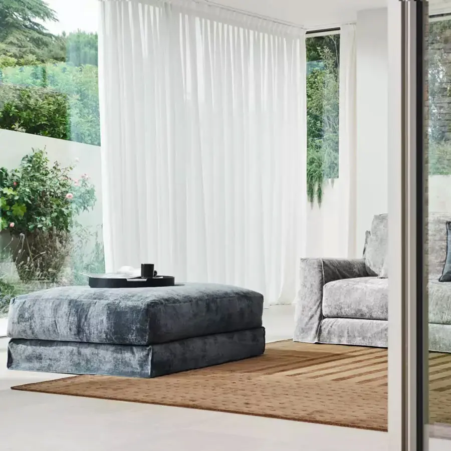 Las formas suaves y confortables de los pufs 28 y 29 están trazadas por el perfil en costura francesa, signo característico de la colección LOLL. Aptos para espacios domésticos y colectivos, están disponibles en dos tamaños, 105x105xh45 cm y 140x140xh45 cm, este último acompañado por cojín con peso que cumple la función de respaldo, ambos ideales en combinación con los sofás de la colección.