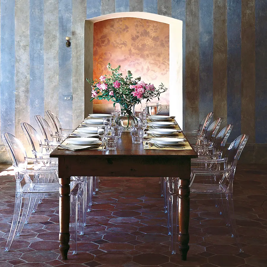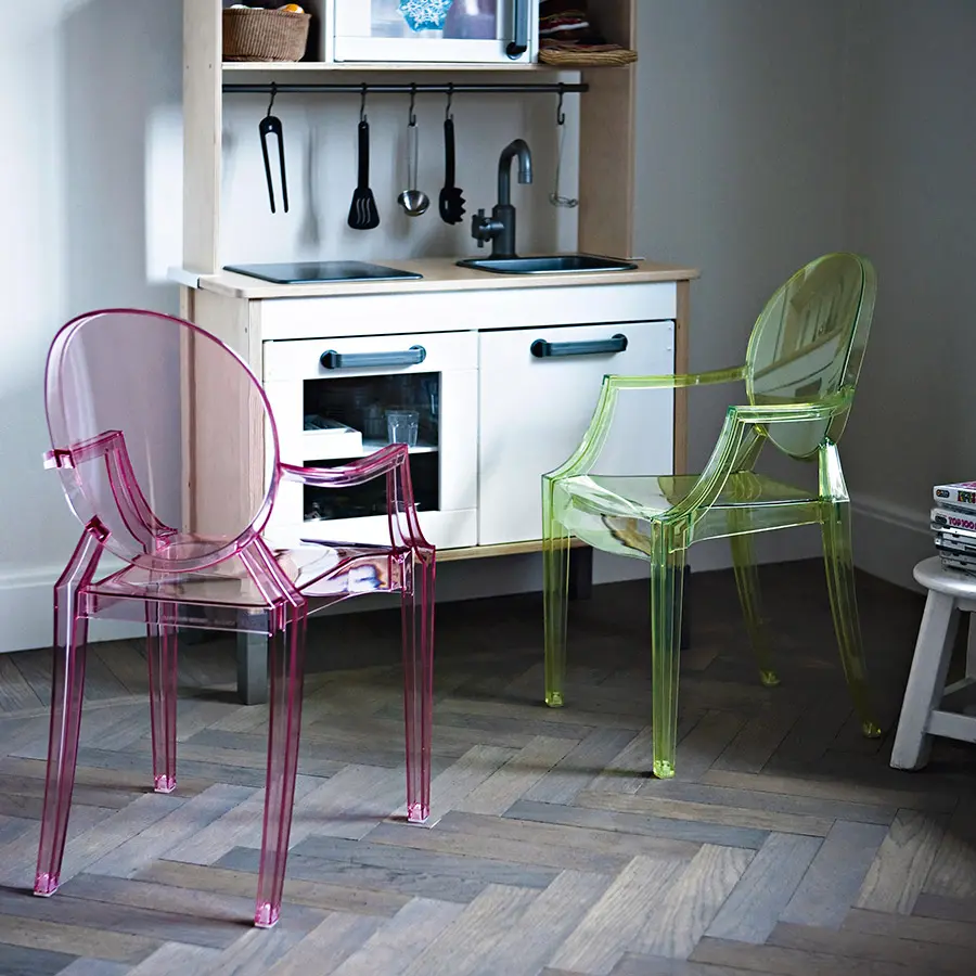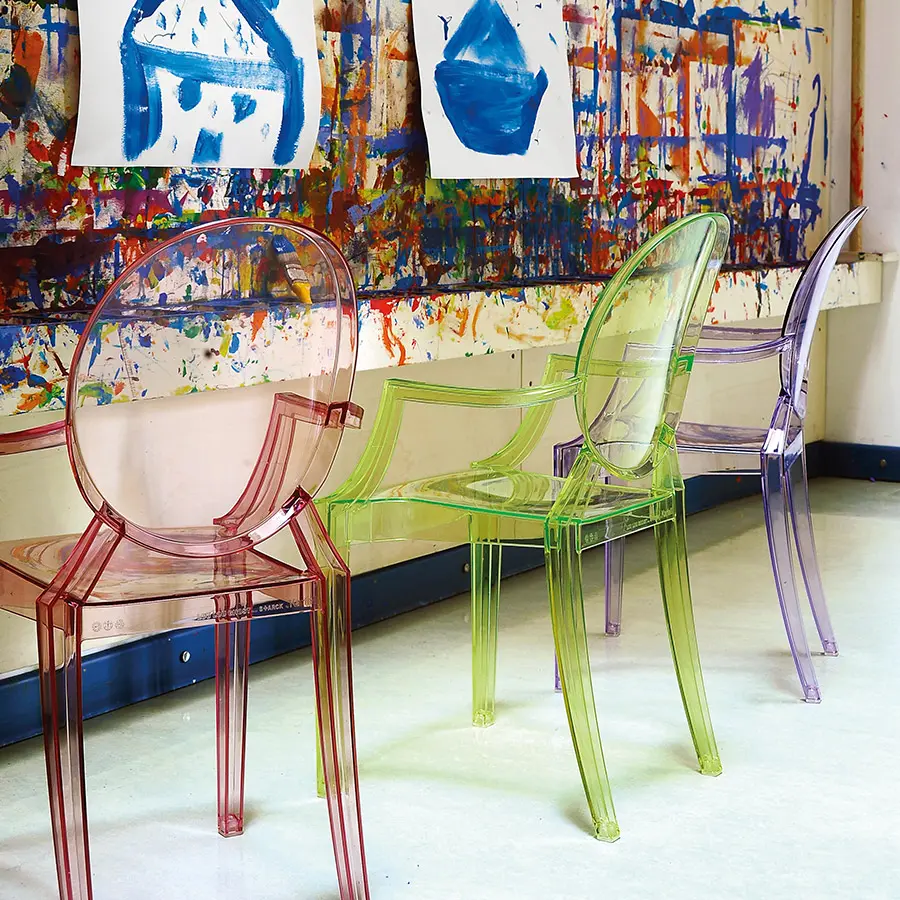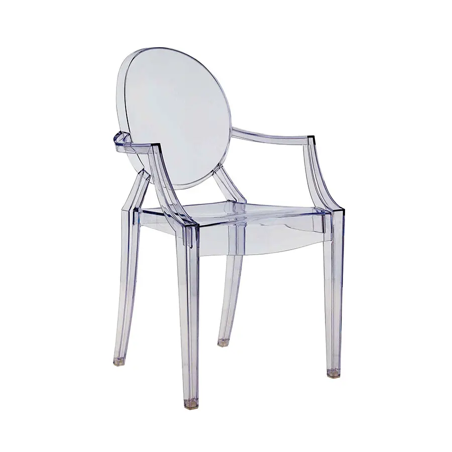 Un cómodo sillón en policarbonato transparente y de color en el estilo Luis XV, es la quintaesencia del barroco revisitado para deslumbrar, emocionar y cautivar. Louis Ghost es el ejemplo más atrevido en el mundo del policarbonato inyectado en un solo molde. A pesar de su aspecto evanescente y cristalino, Louis Ghost es estable y duradero, resistente a los golpes y a la intemperie, y también se puede apilar a seis. Este artículo tiene un gran encanto y un atractivo visual considerable y aporta un toque de elegancia e ironía a cualquier estilo de hogar o área pública. Las sillas Louis Ghost se pueden personalizar en cuatro temas estándar y con otros artículos a pedido específico del cliente con pedidos mínimos de 10 piezas.