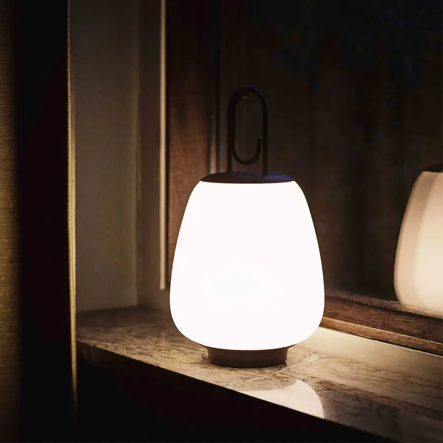 Esta lámpara debe su nombre a la ciudad de Lucca, en el norte de la Toscana. La inspiración provino del hermoso resplandor dorado que luce en las pintorescas ciudades costeras del Mediterráneo. Definida por una suave estructura redondeada de cristal opal, y contenida por elegantes curvas de metal negro, el diseño elegante y compacto crea un ambiente acogedor y relajante. Adecuado tanto para uso interior como exterior, es una pieza versátil que puede trasladarse para iluminar un espacio al aire libre, colocarlo en una mesita de la sala de estar, o enganchada a una pared de una habitación.