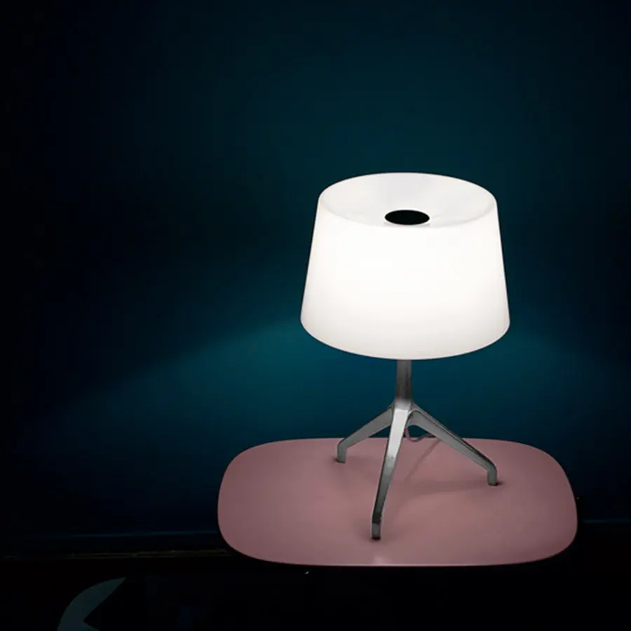 Lámpara de mesa de luz directa y difusa. Vidrio de cristal soplado a boca con espejo de nitrato de plata en forma líquida que cuando está encendida deja entrever la fuente luminosa. Base tipo trípode en vaciado a presión de aluminio acabada y abrillantada a mano en la versión aluminio, pintada con líquido en la versión cromo negro o champagne; pies en silicona resistente al rayado. Con dimmer que permite una regulación gradual.