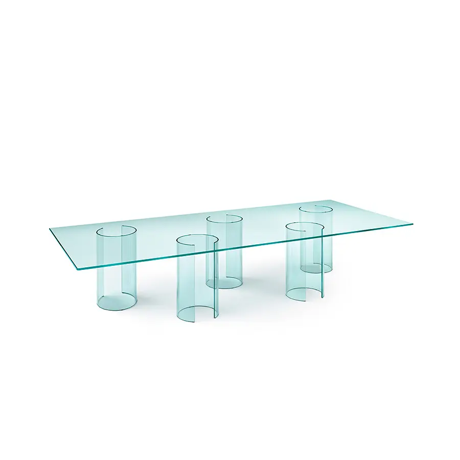 Mesa de comedor con encimera de vidrio en capas con borde pulido brillante de 8 + 8 mm de espesor. También disponible en vidrio ahumado o bronce, o bien transparente extraligero. La base es de vidrio curvado de 10 mm de espesor, compuesta de 2, 3 o 4 cilindros (Ø 40 cm) dependiendo del tamaño y la forma solicitada. También disponible con tapas de tamaño personalizado.