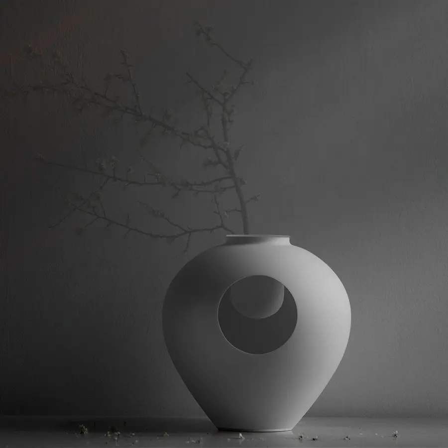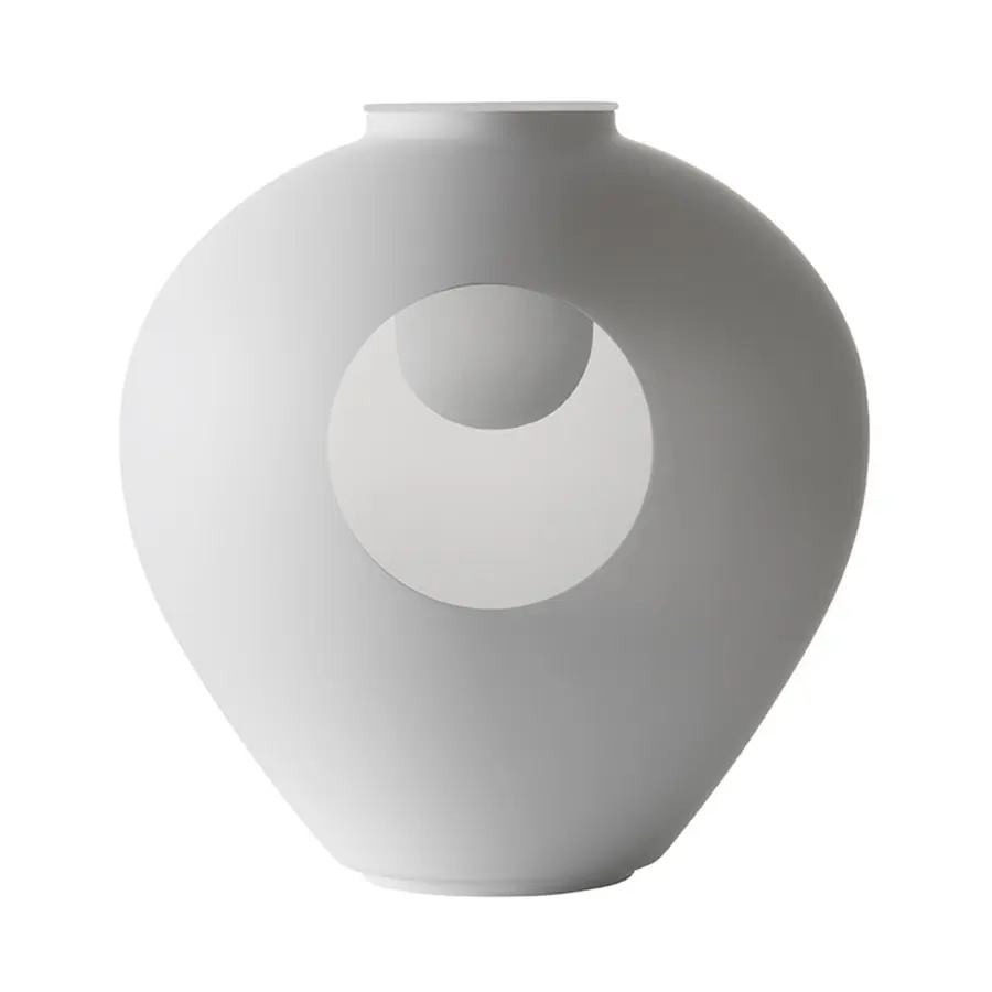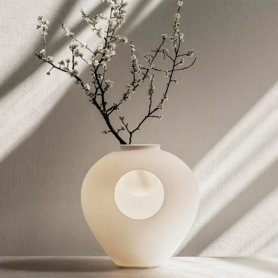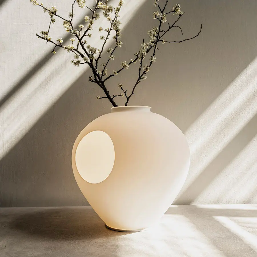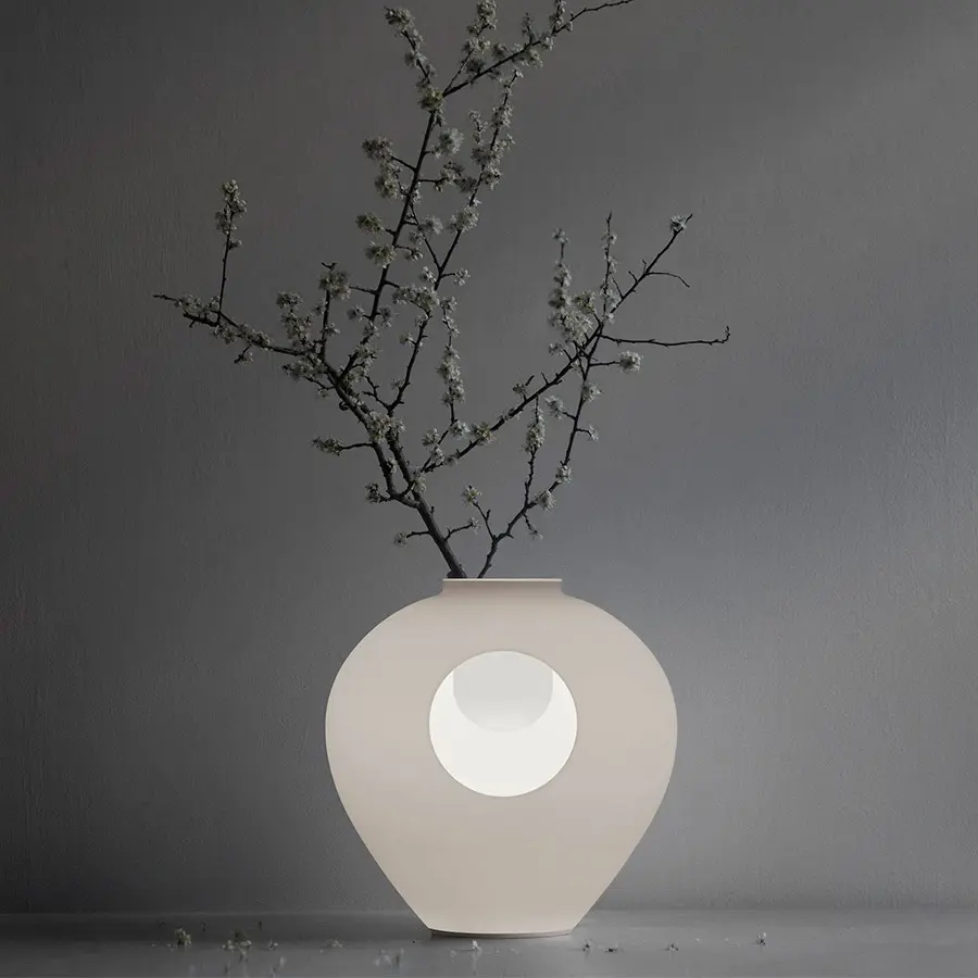 «Madre es el punto de llegada de una reflexión sobre la luz, sobre su papel y su esencia. La forma evoca las caderas anchas de las diosas madres, las divinidades que protegían la fertilidad de la tierra. Pero también evoca la maceta como recipiente de vida porque nace para acoger a los alimentos antes que a las flores.» Andrea Anastasia. Madre es un objeto poético y repleto de asociaciones. El gran cuerpo luminoso de Madre acoge en la ranura superior una maceta de vidrio satinado de borosilicato, donde es posible colocar ramas para crear un conjunto sobrio y elegante. El agujero que interrumpe la maceta en el centro crea una visión mágica; el punto límite y de intercambio entre luz interna y externa reunidas en una única imagen.