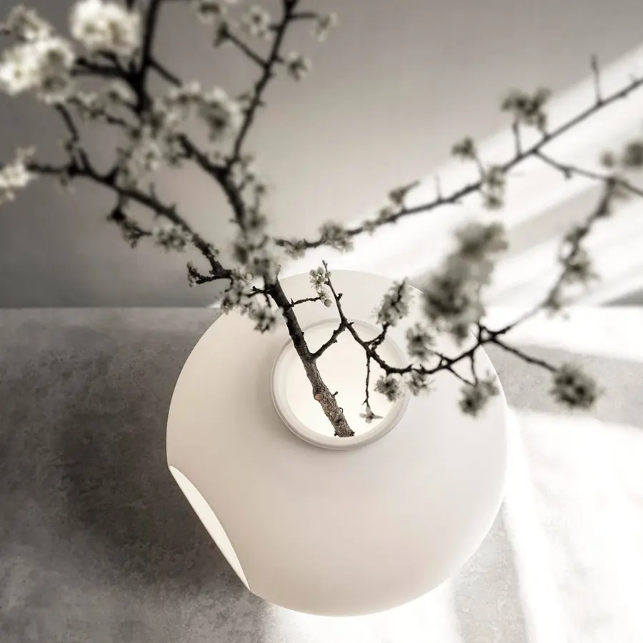 Lámpara de apoyo de luz difusa con LED integrado. El cuerpo de luz está formado por un vidrio soplado a boca y sucesivamente acidificado. El agujero central está cortado con un chorro de agua fino de alta presión que permite un nivel de precisión elevado sin alterar la temperatura del vidrio. La ranura superior, donde se pueden colocar ramas decorativas secas (el uso de líquidos está prohibido) es un vidrio opal de borosilicato. La parte iluminotécnica, formada por una tarjeta LED multichip, está protegida por un disco de policarbonato opal. Dispone de regulador de luz en el cable eléctrico de color gris claro.