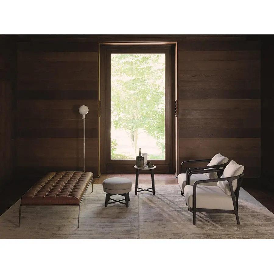 Diseñado en 2014, el sofá-cama Magi es un homenaje al sofá Magister, considerado con razón como un producto emblemático de la empresa. Este elegante sofá-cama retoma la especial confección del capitoneé: el botón tradicional del acolchado clásico se sustituye aquí por un ojal más moderno con dos orificios. Este detalle refinado de confección acentúa el carácter gráfico del acolchado y la capacidad adquirida por la empresa para ejecutar procesos particularmente complejos. El sofá-cama Magi se eleva del suelo mediante una base metálica esencial y puede equiparse con un práctico cojín de rodillo.
