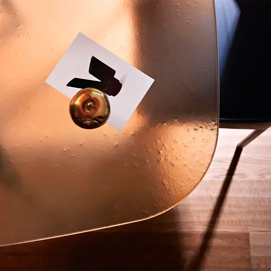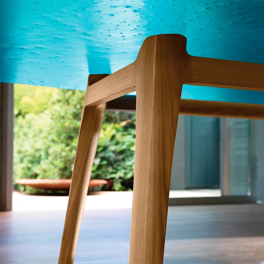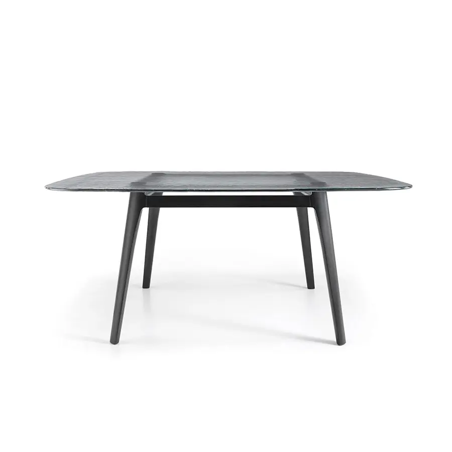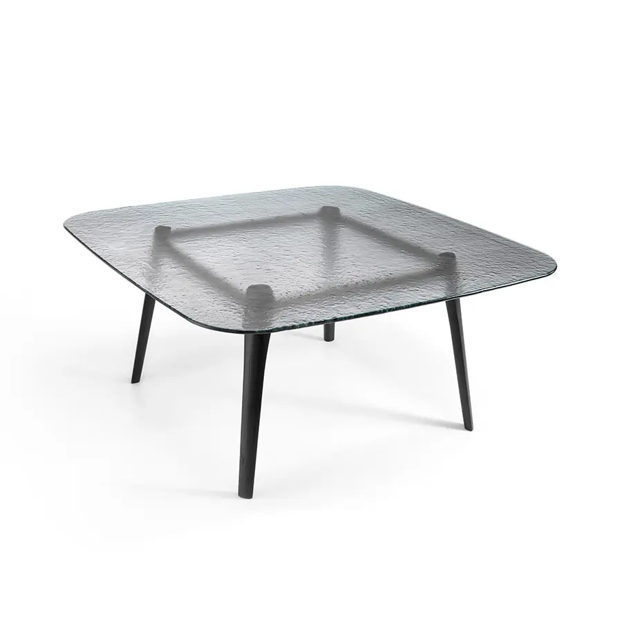 Mesa con tapa de vidrio templado de 15 mm fundido, disponible en colores transparentes Humo, Azúl o Ámbar. Estructura en madera de roble maciza disponible en los acabados natural o color gris.
