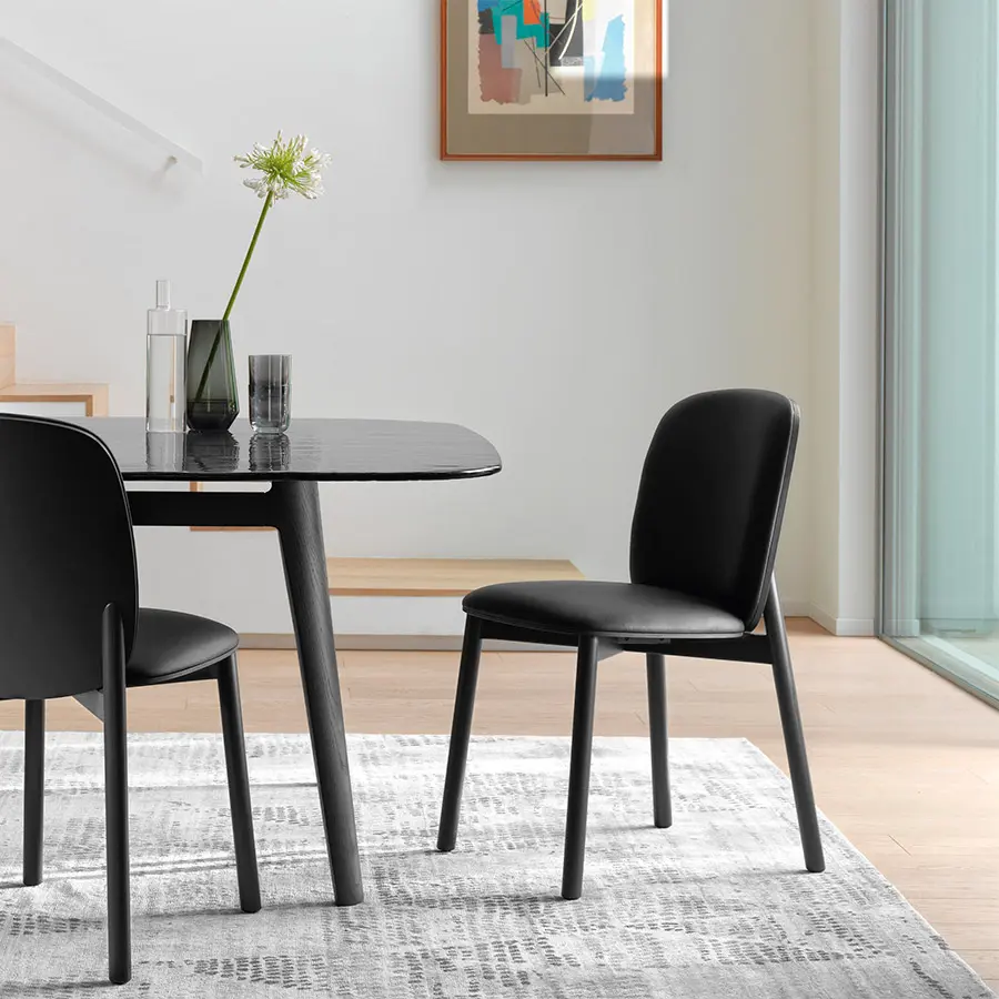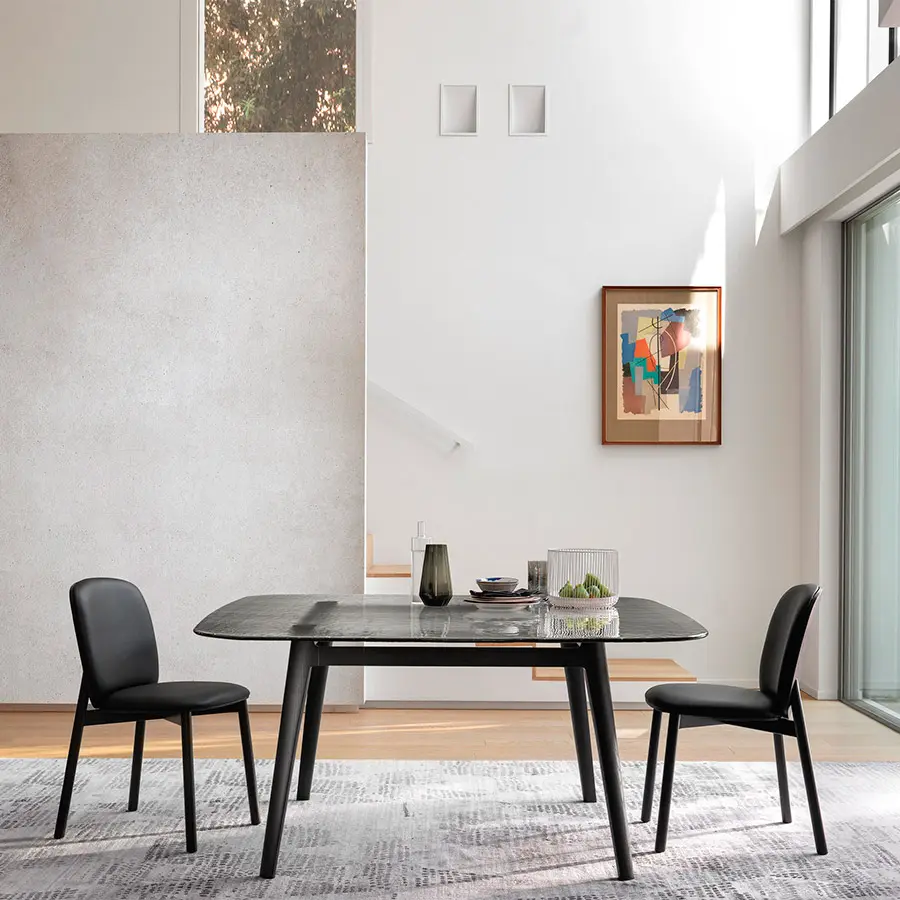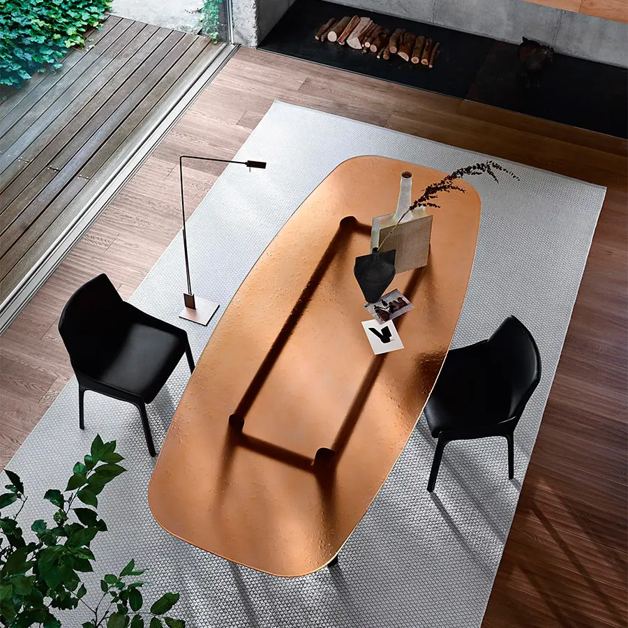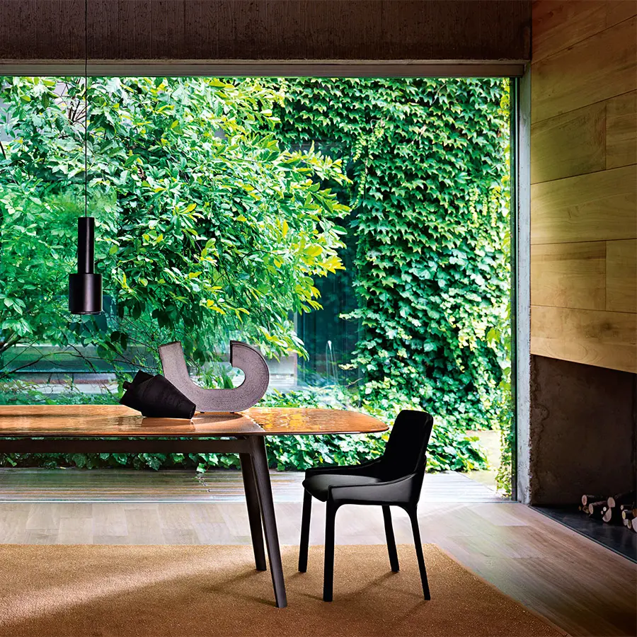 Mesa con tapa de vidrio templado de 15 mm fundido, disponible en colores transparentes Humo, Azúl o Ámbar. Estructura en madera de roble maciza disponible en los acabados natural o color gris.