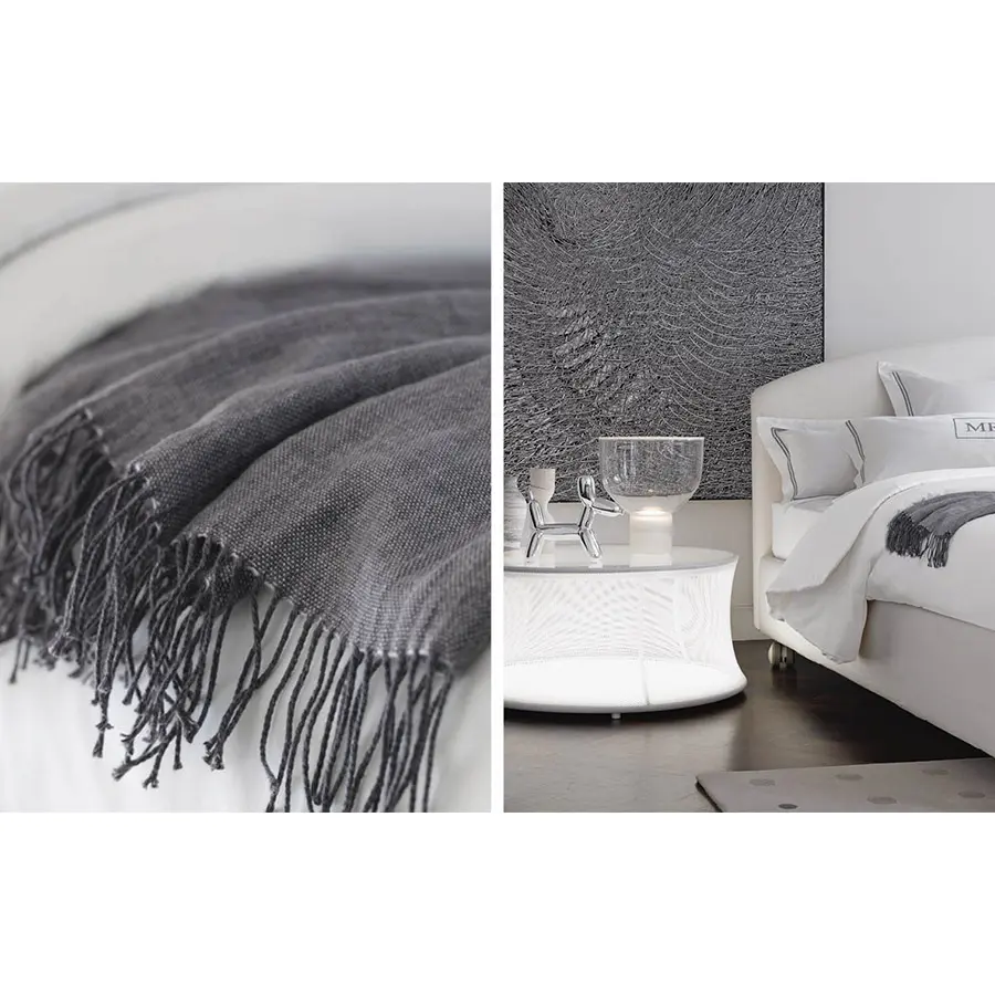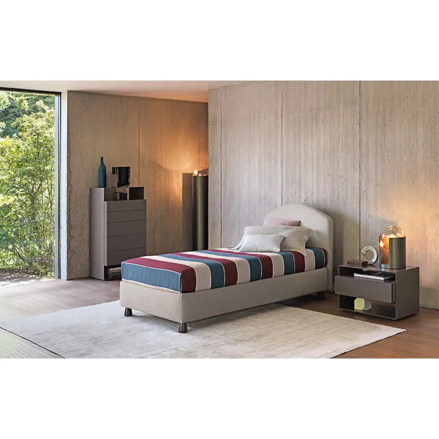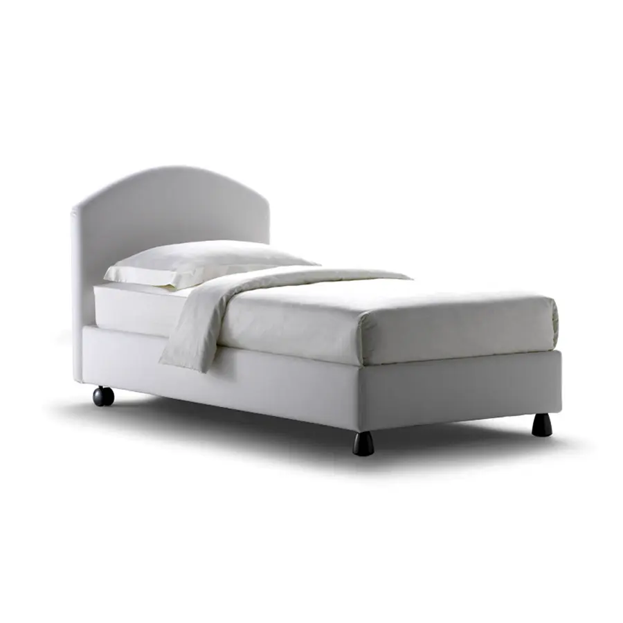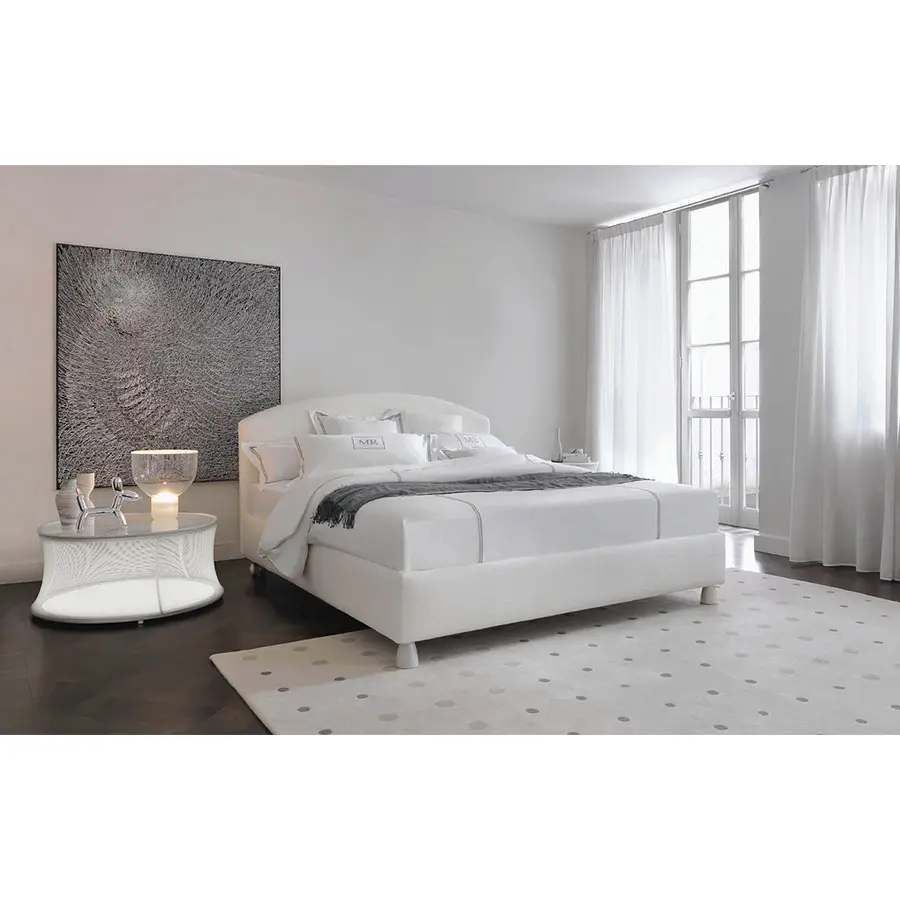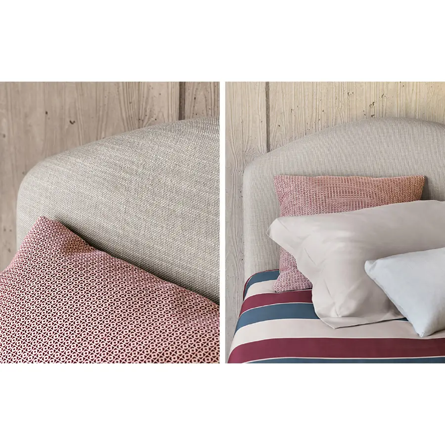 Cama de línea romántica y sin tiempo. Cabecera acolchada y, como la base, forrada en tejido, piel o Ecopelle completamente desenfundables gracias a los prácticos cierres de velcro. Disponible con base de muelles Leonardo, base contenedor, base fija h 25 cm o h 16 cm y con somieres con movimiento eléctrico.