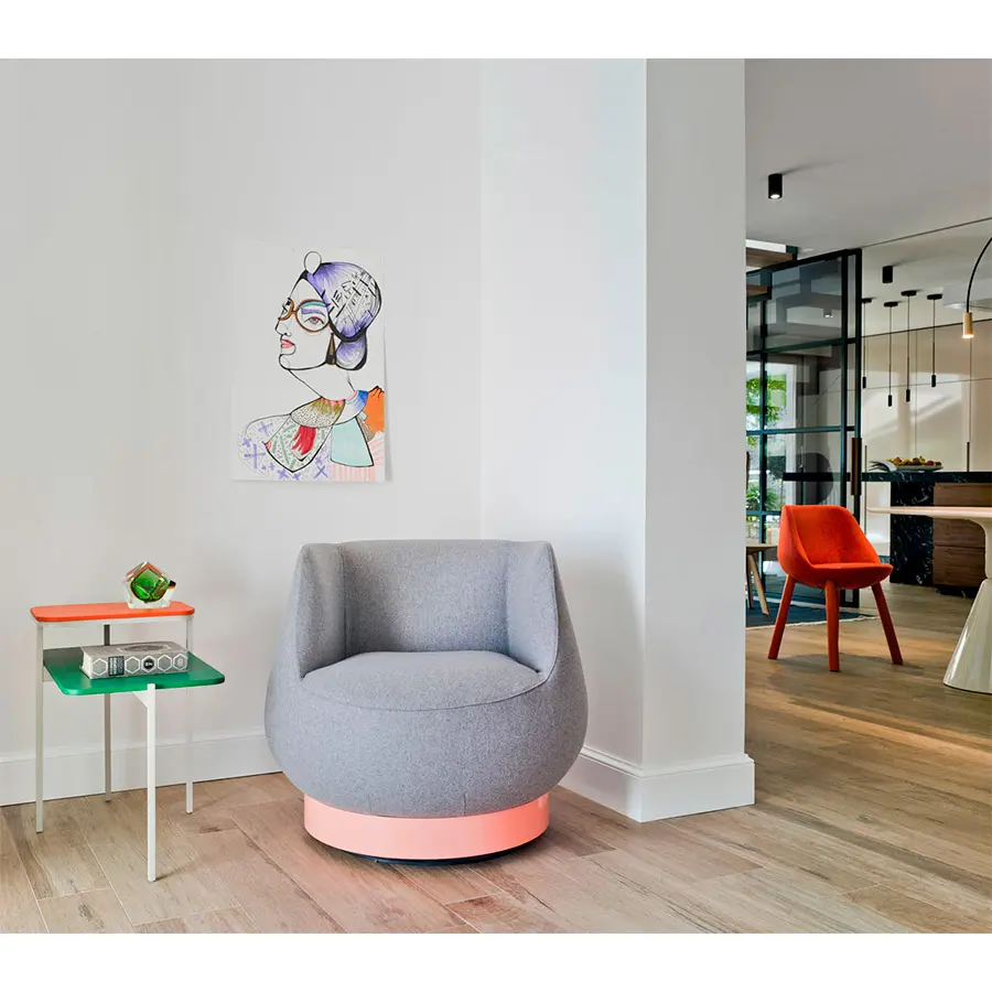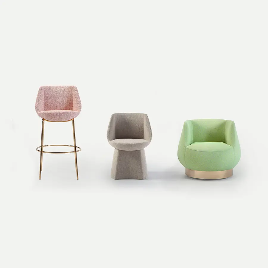 Esta polivalencia se materializa en una amplia oferta de tejidos y acabados para las bases: con patas metálicas o de madera, con base tapizada, con zócalo o pie central