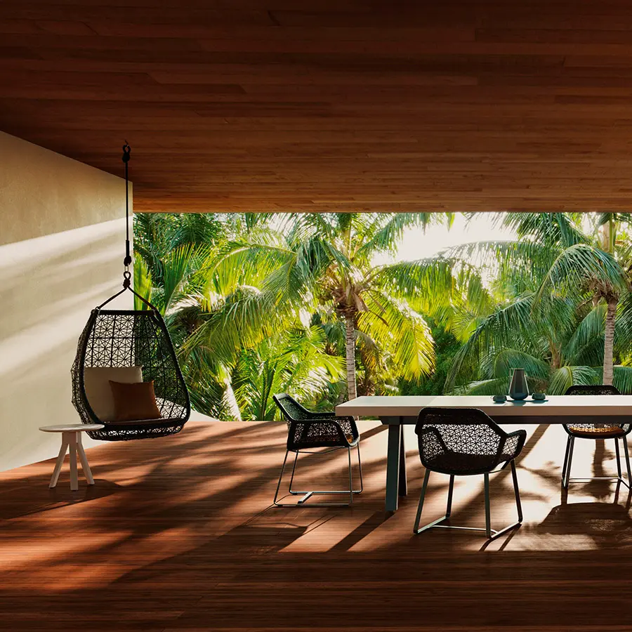 Como una arquitectura se abre a su entorno, la colección Kettal Maia diseñada por Patricia Urquiola muestra una ligereza y una naturalidad elegante. El diseño del trenzado artesanal, la solidez de la estructura de aluminio y la nueva colección de tejidos de porotex y chenille crean una combinación llena de energía. La colección ha sido elegida uno de los diseños más representativos de nuestro siglo.