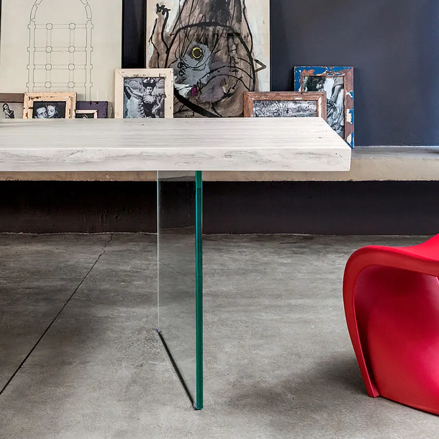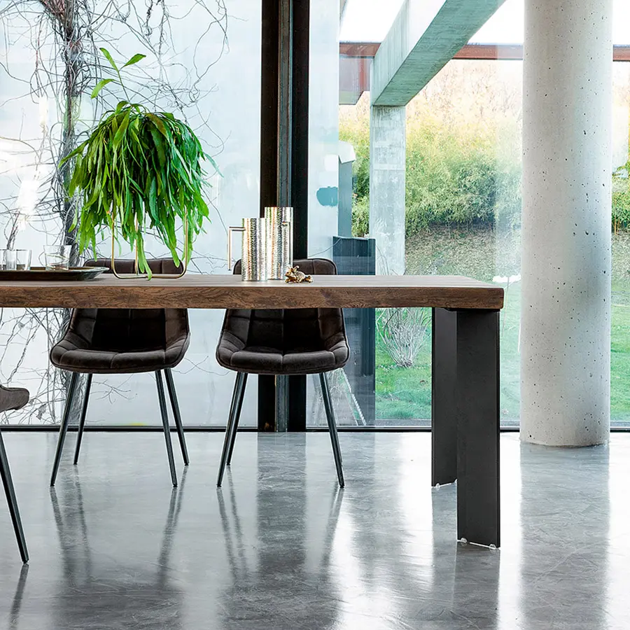 Puedes elegir patas entre las variantes de madera que garantizan la continuidad con la parte superior, el hierro en todos sus acabados, para crear un contraste agradable o el vidrio para aligerar la estructura, consiguiendo que casi desaparezca, con el objetivo de embellecer aún más la nobleza de la encimera de madera maciza.