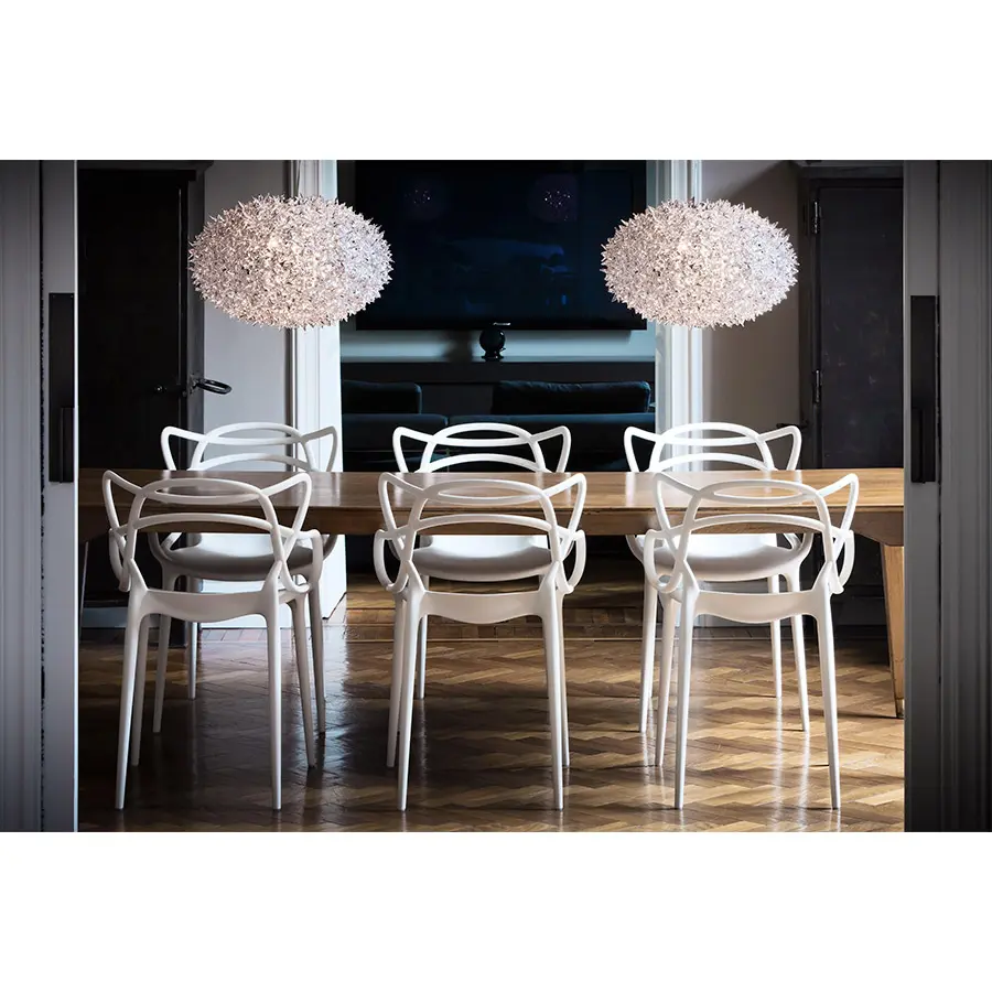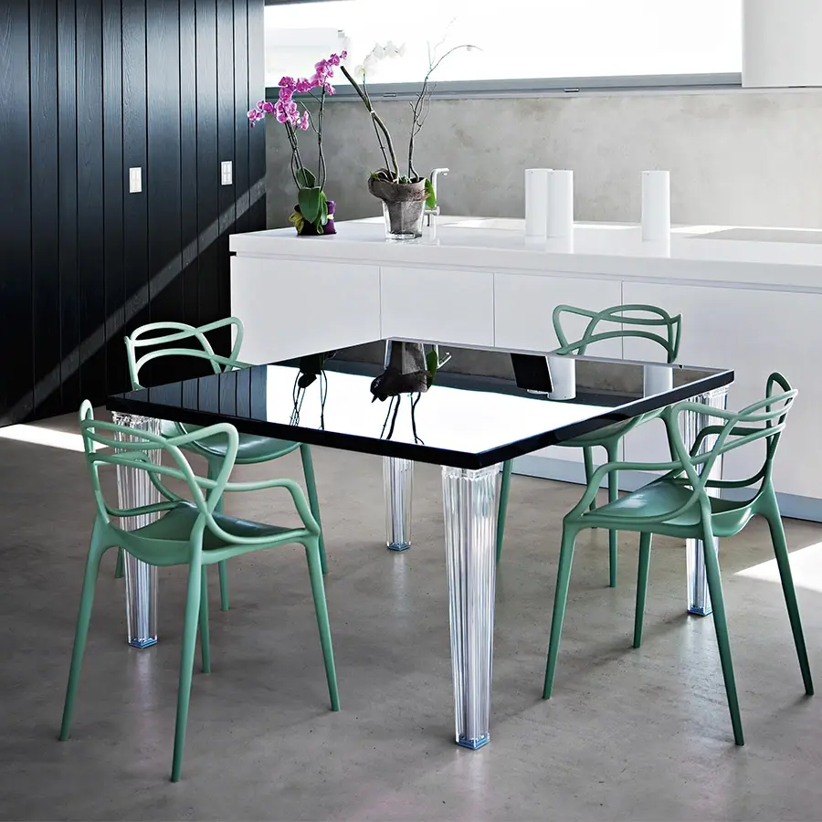 La silla Masters es un inteligente homenaje a tres sillas símbolo, releídas y reinterpretadas por el genio creativo Starck: la “Serie 7” de Arne Jacobsen, la “Tulip Armchair” de Eero Saarinen y la “Eiffel Chair” de Charles Eames, que entrelazan las inconfundibles siluetas en una silla híbrida y sinuosa para dar vida a una fusión de estilos original y atractiva. Apoyado sobre cuatro finas patas, el asiento de Masters es amplio y cómodo. El acabado particular de la silla la convierte en sensualmente aterciopelada. La auténtica nota distintiva de la silla es lógicamente su respaldo, que se caracteriza por las superficies macizas y los huecos creados por el entrelazado curvilíneo de tres respaldos distintos que descienden para confluir en el perímetro del asiento. Ligera, práctica, apilable y disponible en numerosos colores, Masters se puede utilizar también en el exterior. La silla Masters ha sido condecorada con el prestigioso premio “Good Design Award 2010” del Chicago Athenaeum – Museum of Architecture and Design.