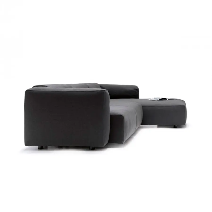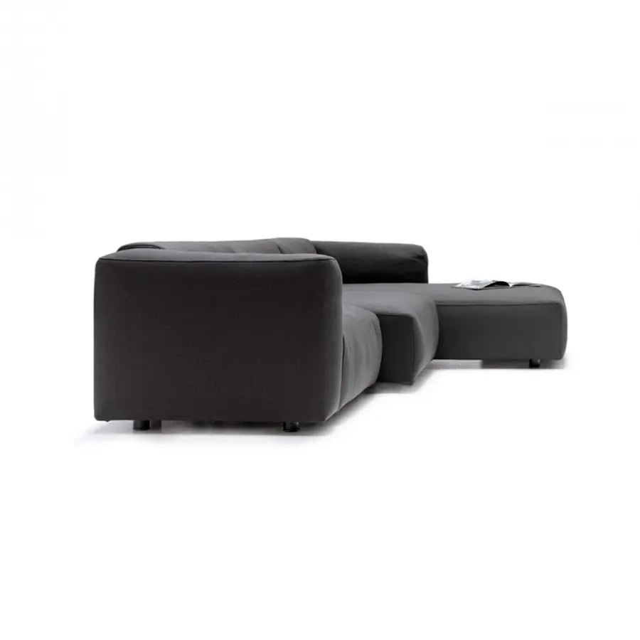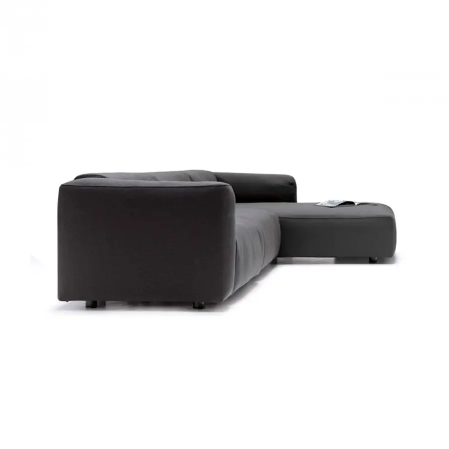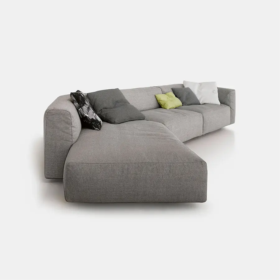 Un sistema de sofás y sillones. Con marco en madera maciza y cinturones elásticos y relleno de poliéter de densidad variable indeformable y plumón, o en guata de poliéster. La nueva costura cosida superior resalta los brazos en el extremo, la esquina y las unidades especiales. Un sistema deslizante permite aumentar la profundidad del asiento en 18 cm para una mejor comodidad.