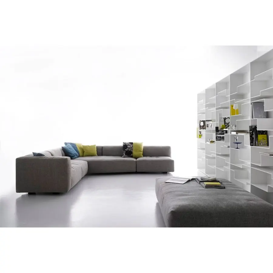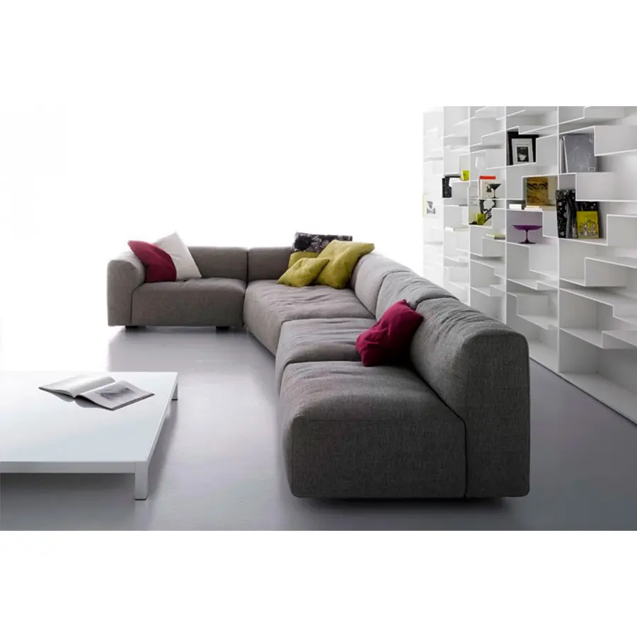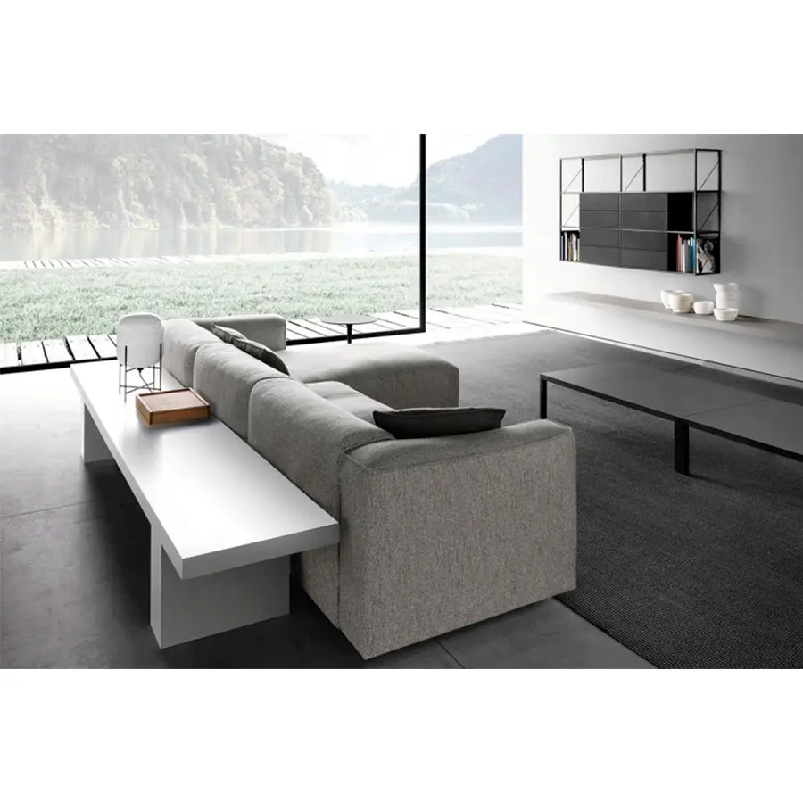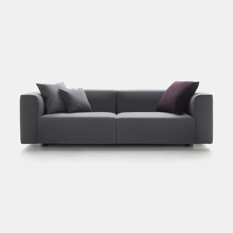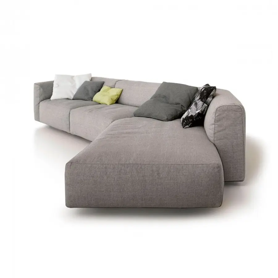 Un sistema de sofás y sillones. Con marco en madera maciza y cinturones elásticos y relleno de poliéter de densidad variable indeformable y plumón, o en guata de poliéster. La nueva costura cosida superior resalta los brazos en el extremo, la esquina y las unidades especiales. Un sistema deslizante permite aumentar la profundidad del asiento en 18 cm para una mejor comodidad.