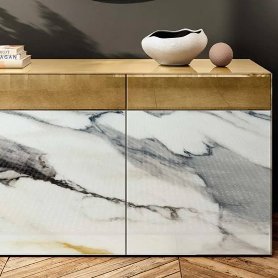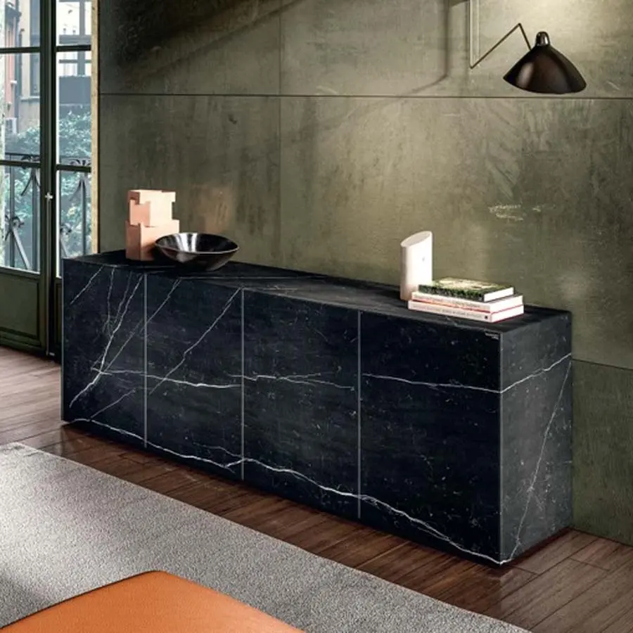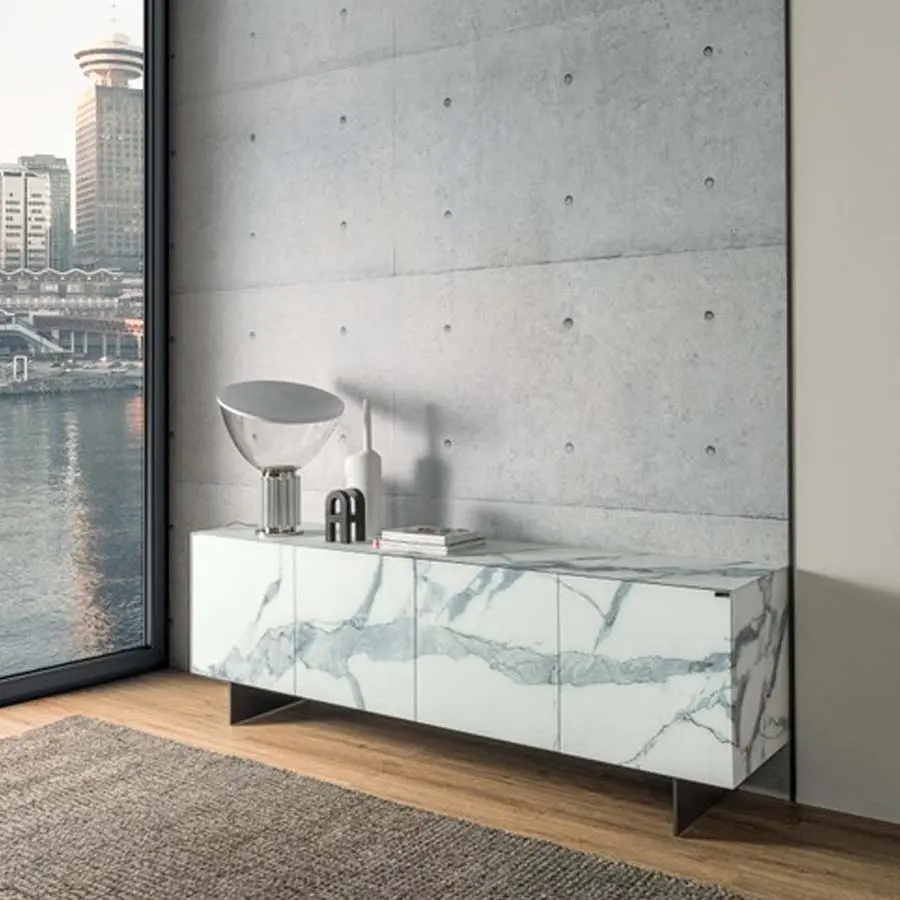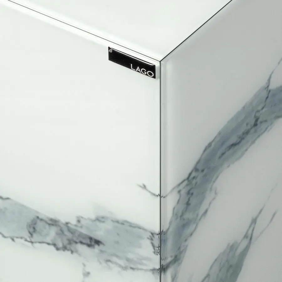 El aparador Materia de Lago destaca por su diseño limpio y contemporáneo, con volúmenes definidos por un cristal templado de 4 mm que aporta resistencia y una estética impecable. Disponible en versión suspendida o con apoyo al suelo sobre elegantes soportes metálicos, es una pieza que aporta sofisticación sin perder funcionalidad. Su sistema de acabados XGlass permite una personalización total con opciones que imitan vetas de mármol, texturas metálicas, madera natural o tejidos, en acabados mate o brillo, logrando una continuidad visual que realza la belleza de los materiales.