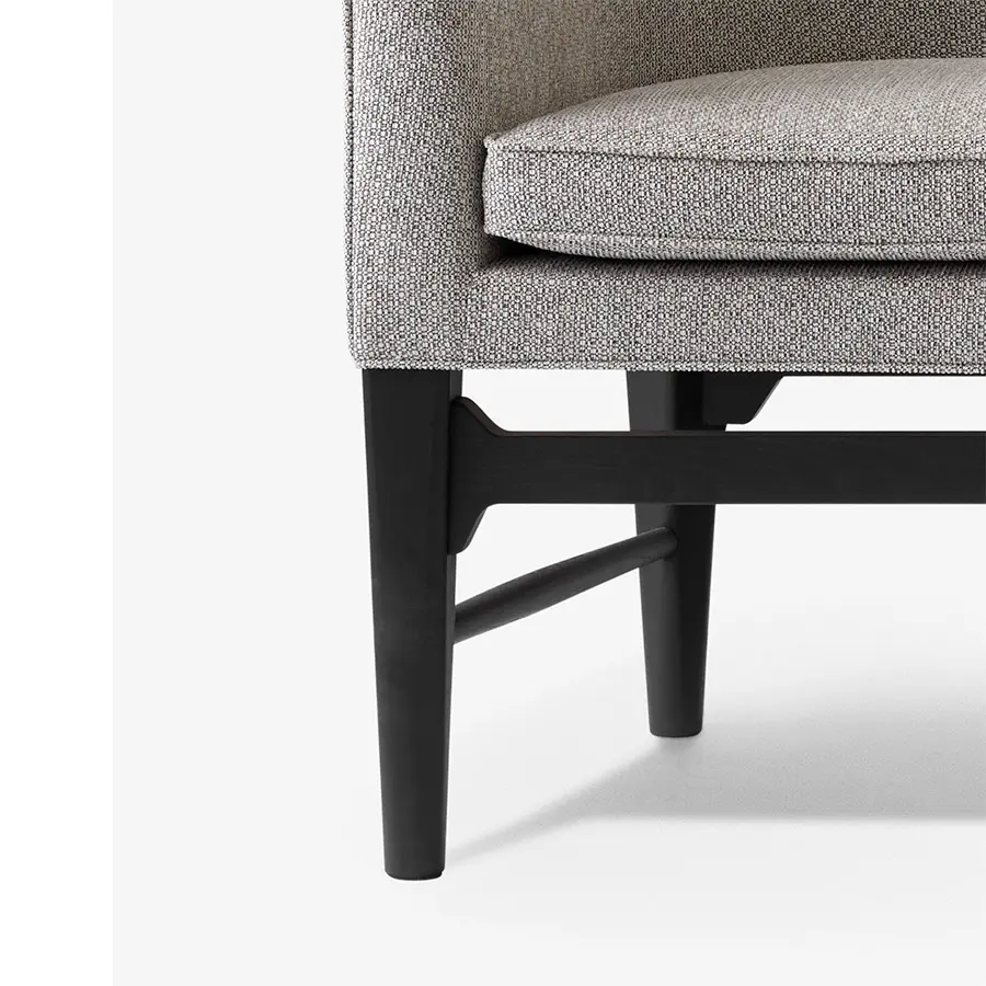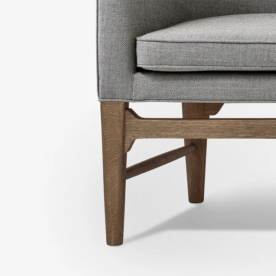 Base de roble macizo tratado con aceites o teñido en negro, marco interior de madera maciza con espuma CMHR. Tapizado en distintos tejidos.