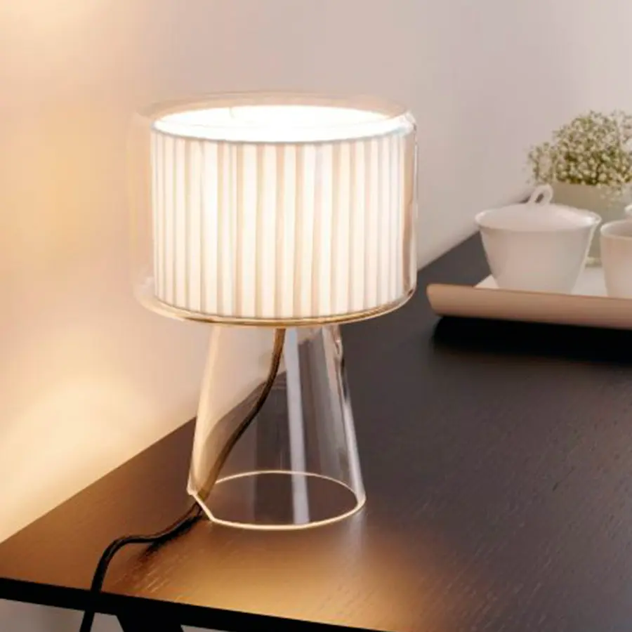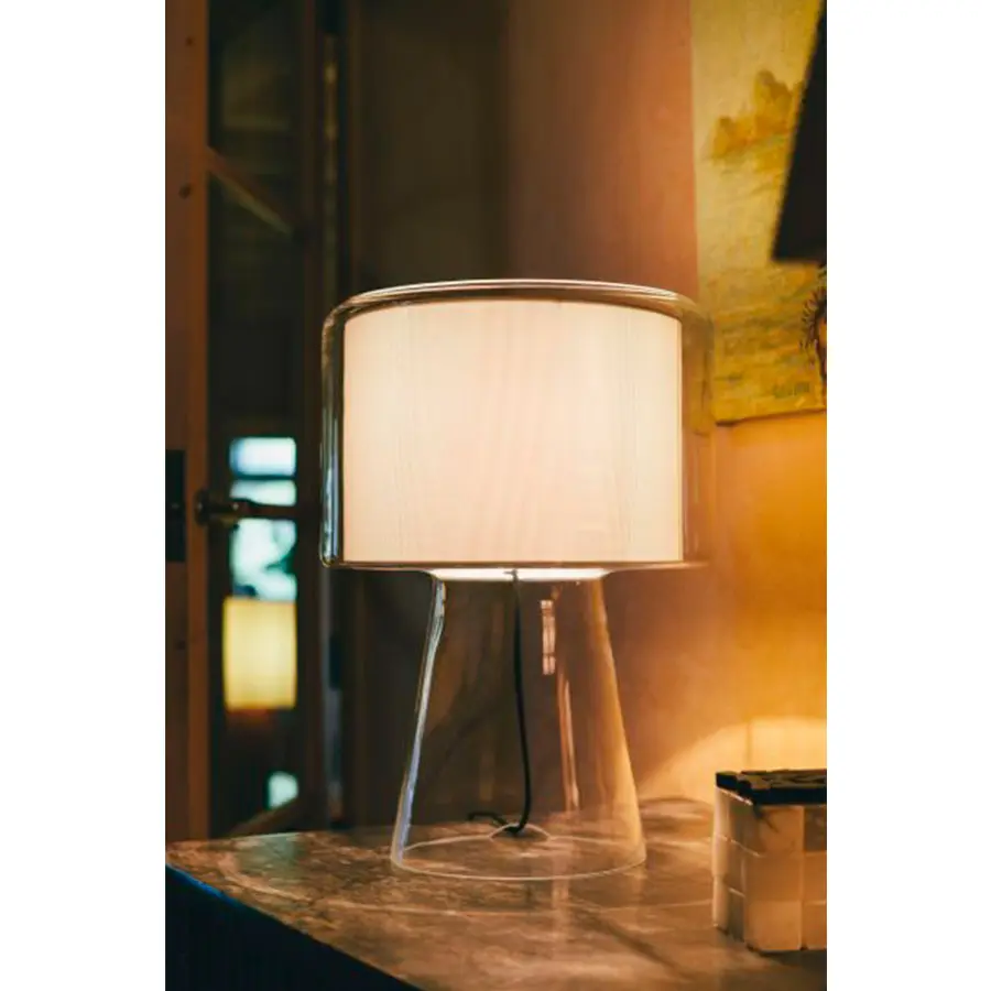 El difusor interior está disponible en cintas de algodón crudo, y en una versión más moderna y minimalista, en blanco perla.Pantalla textil que flota en una estructura de cristal soplado transparente. Disco difusor opal en la parte superior.