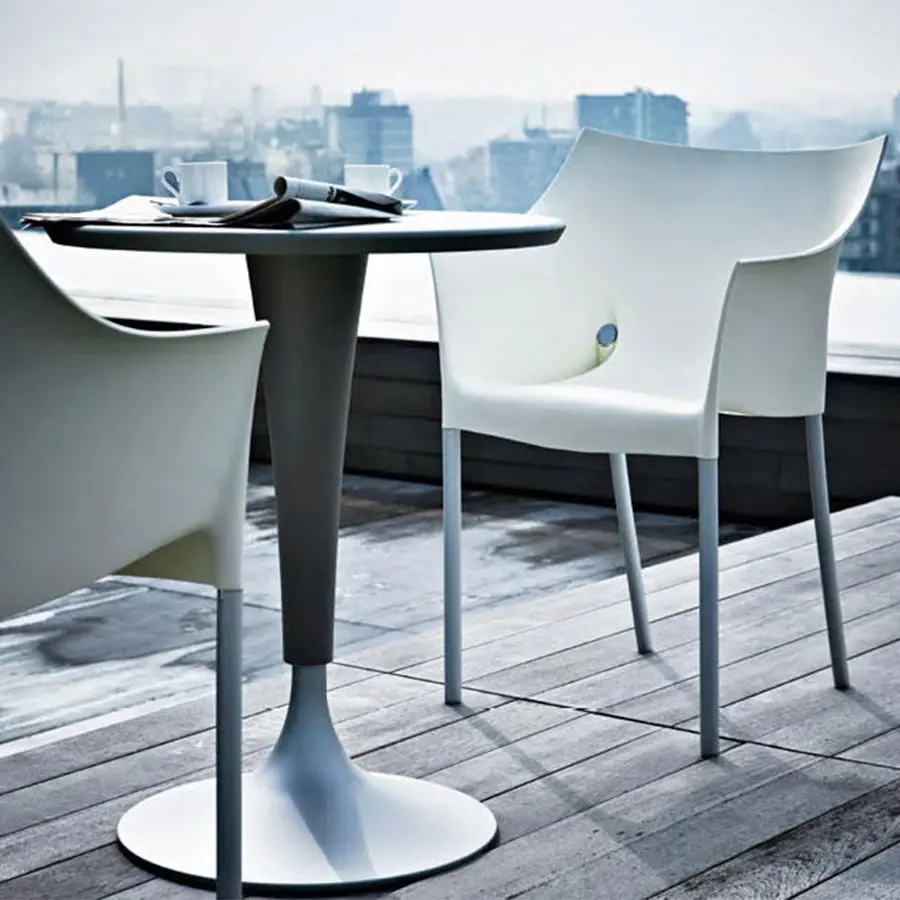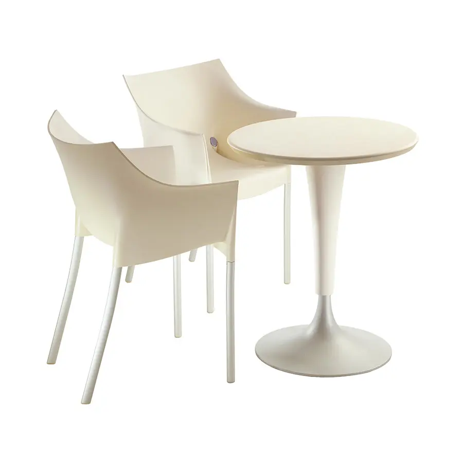 La silla Dr. NO se combina con una mesa redonda, Dr. NA, propuesta como complemento directo al asiento. La superficie pintada a prueba de arañazos y la pata central cónica de plástico y aluminio permiten al Dr. NA vivir por separado con el pequeño sillón para formar un concepto dual ideal.