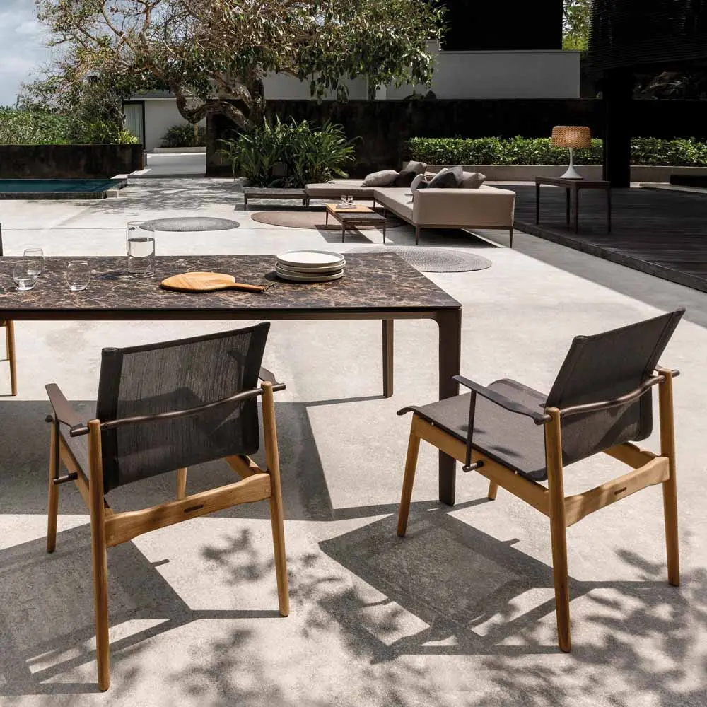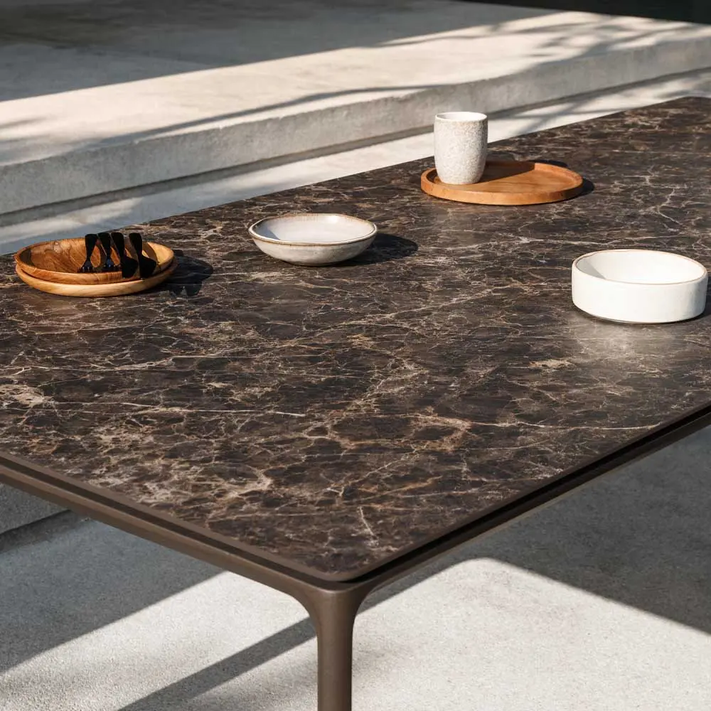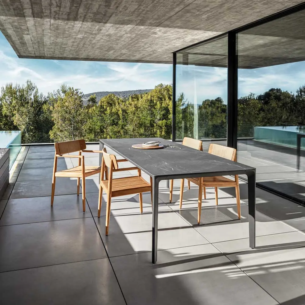 La mesa de exterior Carver es un diseño de Henrik Pedersen para la marca Gloster. Se trata de un diseño elegante y moderno, en la que destaca el contraste armónico de sus materiales, con una discreta estructura de aluminio que hace destacar su espectacular sobre cerámico. Disponible en distintos acabados de encimera.
