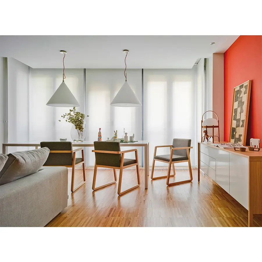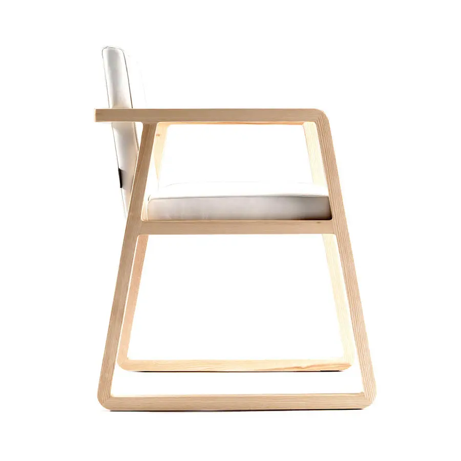 La estructura interna es de madera revestida de espuma. La estructura externa es de madera maciza de fresno tintada. El bastidor de asiento está preparado con cinchas NEA. El bastidor de respaldo está preparado con tablero DM. El confeccionado de asientos y respaldos es de espuma HR de densidades diferenciadas. Los taburetes disponen de un reposapiés de acero inoxidable satinado. Los tapizados en tela, piel o vinilo son siempre fijos, no desenfundables.