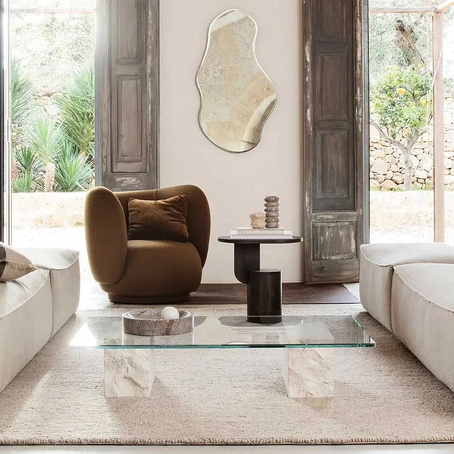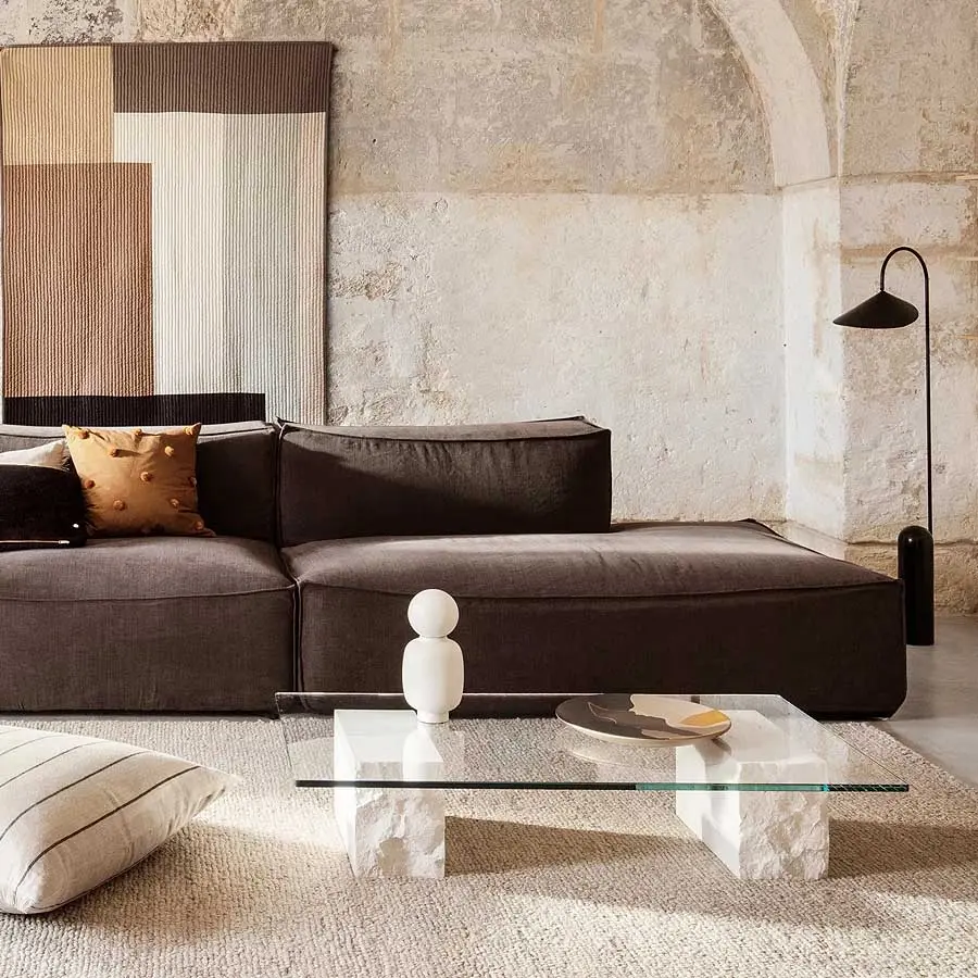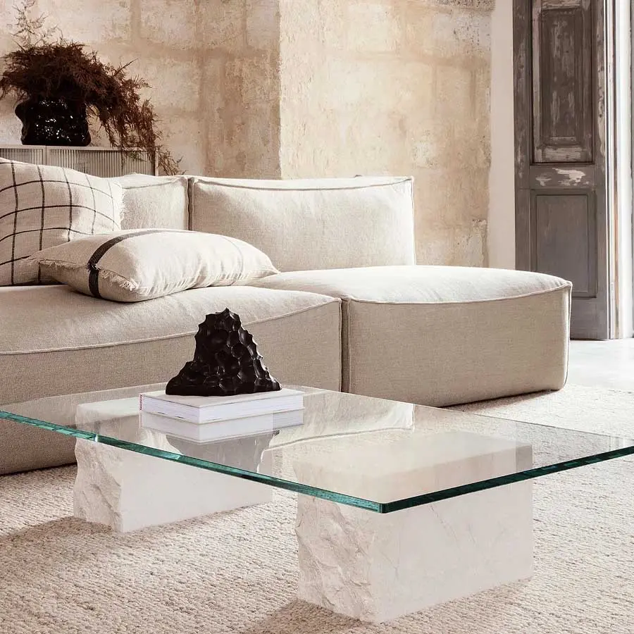 Contemporánea y elegante, la Mesa de Centro Mineral de Ferm Living muestra la belleza natural de la piedra y el vidrio, con dos bloques de mármol Bianco Curia, uno de los cuales tiene un extremo sin pulir para un acabado crudo y textural. Una duradera superficie de vidrio rectangular se asienta sobre los bloques, proporcionando un espacio para colocar una bebida, exhibir flores o dejar un libro o revista. Idealmente utilizada en una sala de estar frente a un sofá o sillón, esta impactante pieza escultórica aporta un estilo distintivo y practicidad a tu hogar.