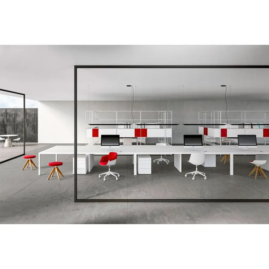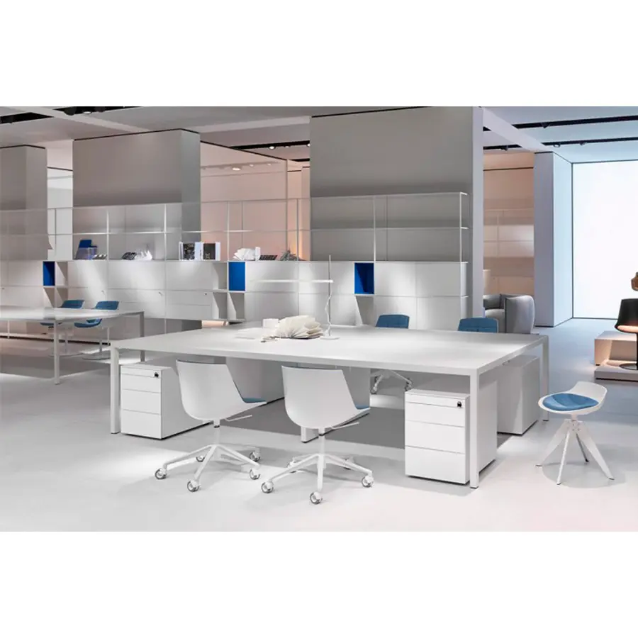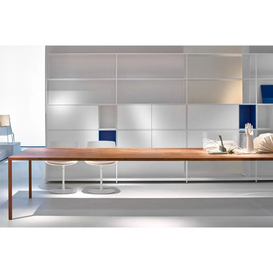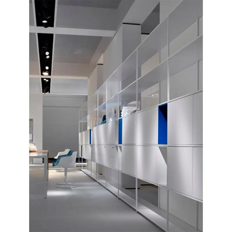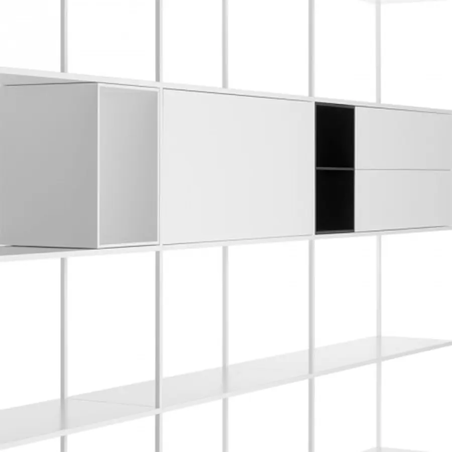 La considerable extensión del estante en aluminio extruido combinado con el sistema de unión, ha permitido desarrollar el sistema en longitud, haciéndolo moderno y ajustable a cualquier tipo de entorno. Modular y flexible incluso gracias a los nuevos tipos de unidades de almacenamiento. Esto puede ser con puertas o cajones abiertos, de puertas, con solapas. Simplemente descansan dentro de la estructura y se pueden reposicionar con bastante facilidad, lo que permite cumplir con los requisitos de almacenamiento que se deseen. Montantes y estantes de aluminio extruido lacado blanco mate y gris grafito (100% reciclable).