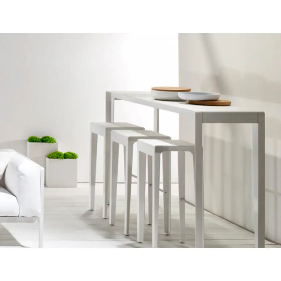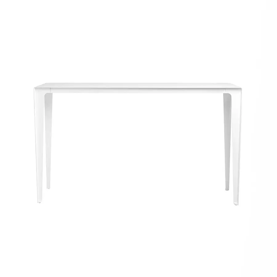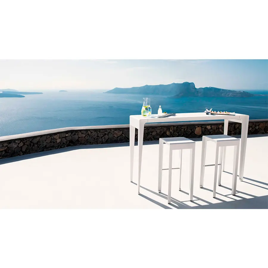 Minimalismo con un toque juguetón. La colección Mirthe reúne todos los elementos de un típico mueble de exterior de Tribù: líneas puras y limpias que no pasan de moda, con una imagen fresca y moderna. Este mueble de bar hace que cada fiesta sea un éxito. Las patas se han soldado longitudinalmente, sin juntas, en un ángulo de 90° y se han integrado en el tablero. Los ángulos redondeados del tablero de la mesa y del asiento de la silla aportan un look suave. El diseñador eligió conscientemente el aluminio: resistente, ligero, completamente reciclable, con poco mantenimiento e ideal para exteriores.