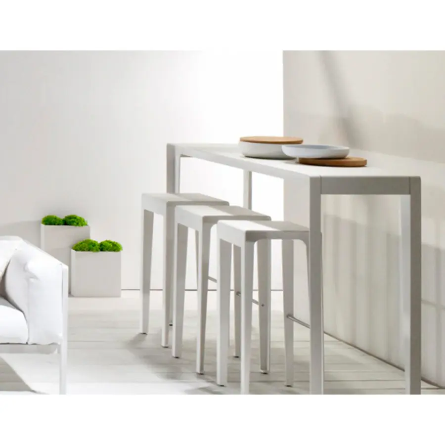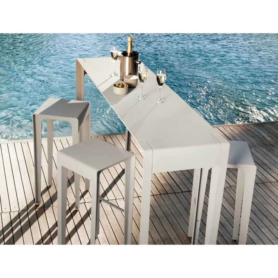 Minimalismo con un toque juguetón. La colección Mirthe reúne todos los elementos de un típico mueble de exterior de Tribù: líneas puras y limpias que no pasan de moda, con una imagen fresca y moderna. Este mueble de bar hace que cada fiesta sea un éxito. Las patas se han soldado longitudinalmente, sin juntas, en un ángulo de 90° y se han integrado en el tablero. Los ángulos redondeados del tablero de la mesa y del asiento de la silla aportan un look suave. El diseñador eligió conscientemente el aluminio: resistente, ligero, completamente reciclable, con poco mantenimiento e ideal para exteriores.