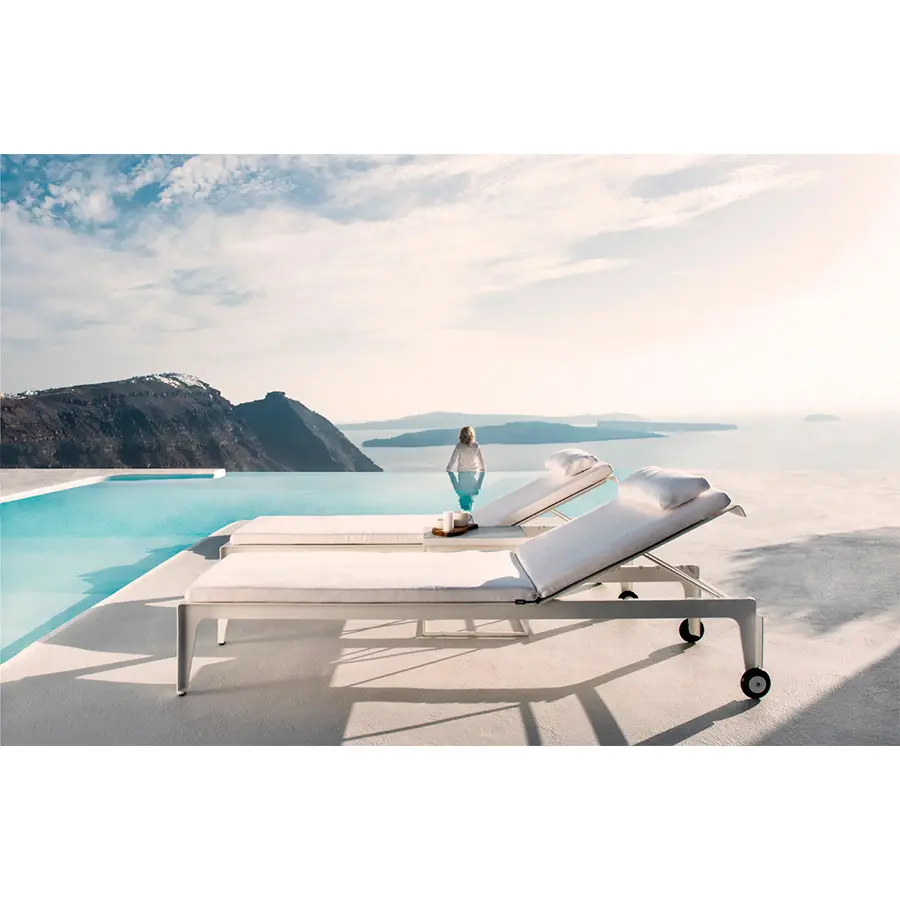 Minimalismo con un toque juguetón. La colección Mirthe reúne todos los elementos de un típico mueble de exterior de Tribù: líneas puras y limpias que no pasan de moda, con una imagen fresca y moderna. El diseñador eligió conscientemente el aluminio: resistente, ligero, completamente reciclable, con poco mantenimiento e ideal para exteriores.