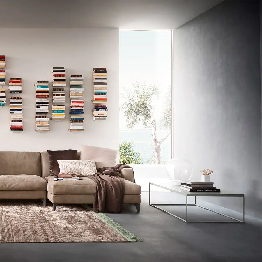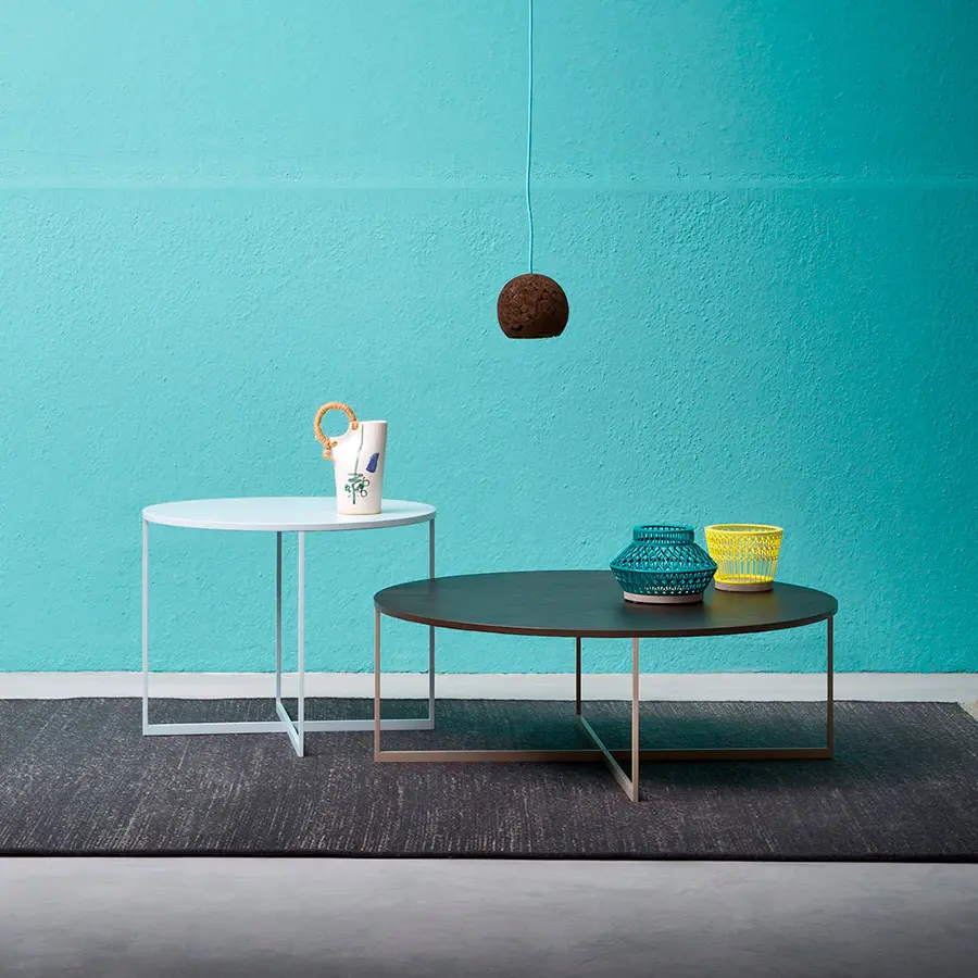 Moca es una mesa de centro redonda con estructura de metal barnizado y tapa de madera. Mocha está disponible en dos tamaños.