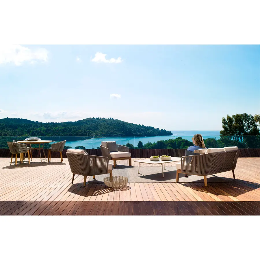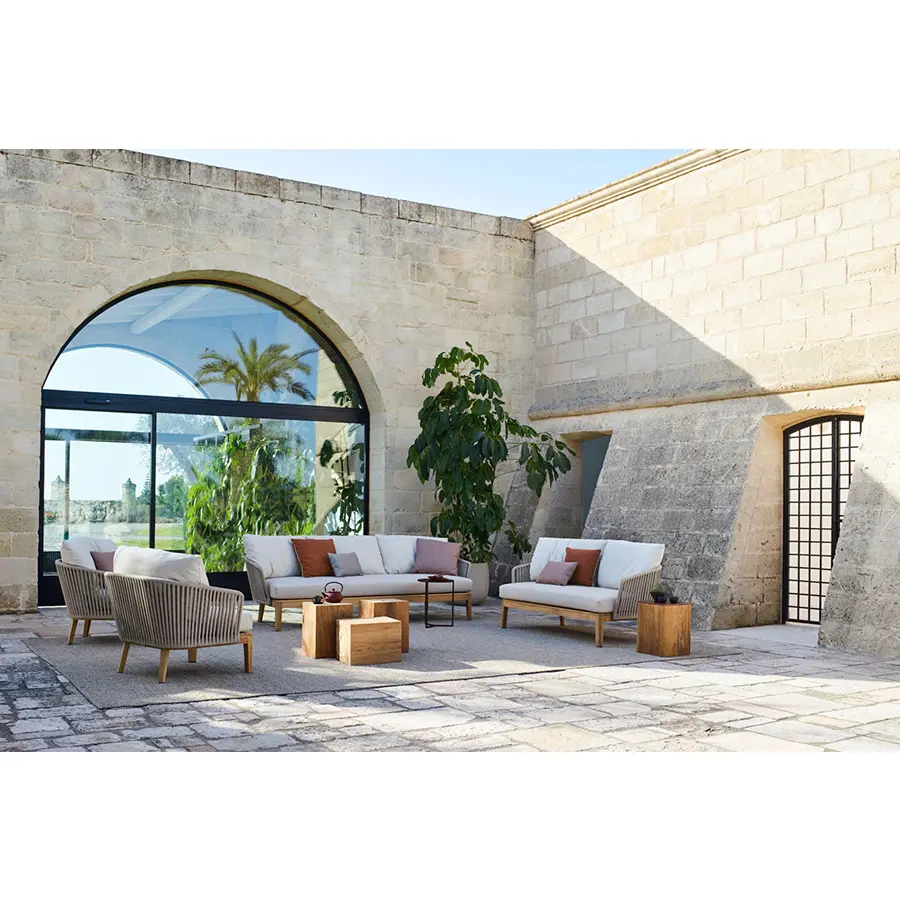 El vaporoso diseño de la colección Mood y la cálida combinación de teca y mimbre trenzado a mano, crea instantáneamente un ambiente especial en su terraza. El trenzado de color earthbrown o stonegrey en Tricord está compuesto por poliolefina, una fibra ecológica y resistente a la intemperie que ofrece un aspecto y una sensación muy naturales. Ofrece un confort muy agradable gracias a los cómodos cojines de exterior.