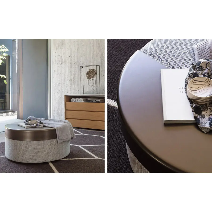 Se completan con bandejas amovibles, con acabado bronce anodizado o bruñido mate, cuya peculiar forma de medialuna sigue perfectamente el radio de curvatura del puf y permite utilizarlas como superficies de apoyo estables.