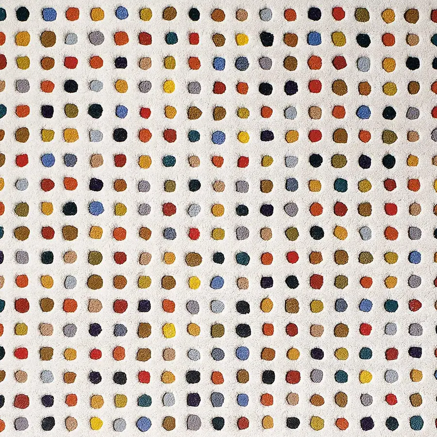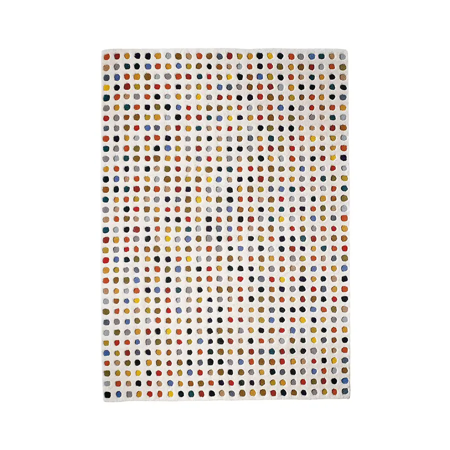 Alegre y colorista, nuestra alfombra Mota2 es una pieza de tacto muy suave elaborada con la innovadora técnica manual hand tufted, empleando 100% lana virgen. Su rasgo más curioso es que su superficie presenta dos espesores diferentes: uno más voluminoso, en color blanco roto, y otro rebajado, para el moteado a modo de lunares de colores.