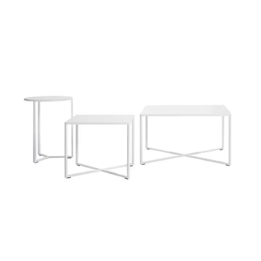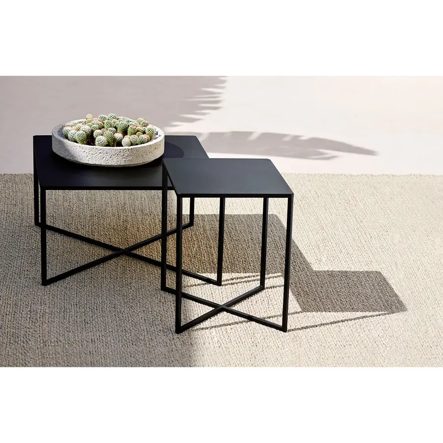 Las nuevas Natal Alu X-mesas, realizadas en aluminio con revestimiento en polvo, combinan funcionalidad y un sutil diseño contemporáneo. Las estilizadas líneas de la base con estructura en cruz y las uniones anguladas de las esquinas son atractivos toques típicos de la atención al detalle de Tribù.