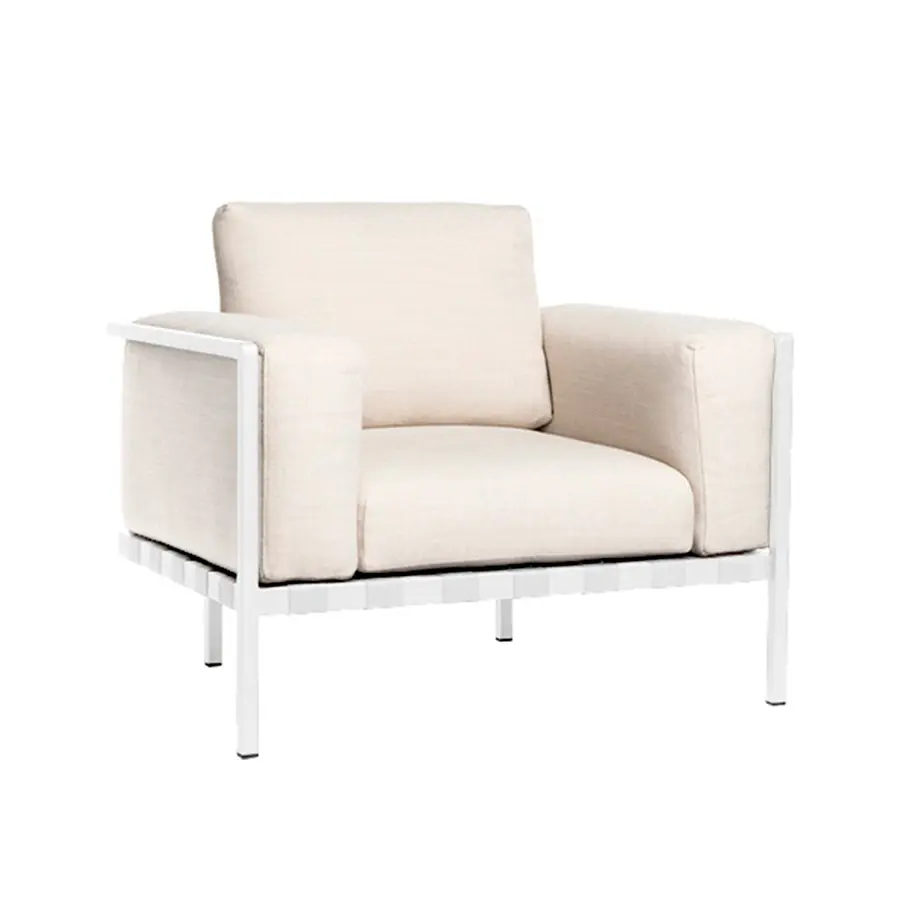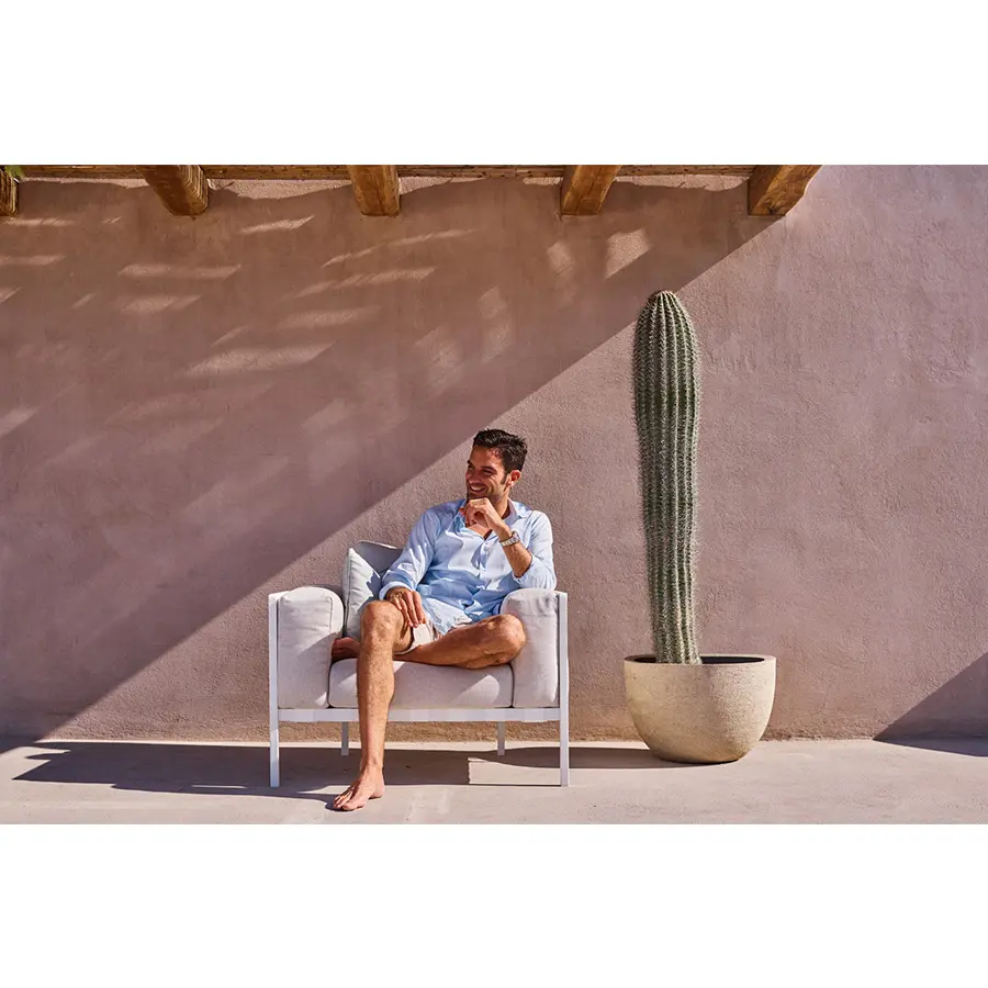El diseño del sofá Natal Alu es el típico de Tribù: un sutil marco con preciosos apoyabrazos arqueados que contrastan elegantemente con el volumen de los cojines que son soportados por amplias bandas de textileno. Atemporal y elegante, el Sofá Natal Alu es un sofá de exterior ideal para cualquier terraza. Con trece módulos diferentes, marcos de dos colores diferentes y más de 100 tejidos diferentes, las posibilidades son infinitas. Los cojines para exteriores con relleno impermeable son únicos. Son tan resistentes que incluso cuando llueve pueden dejarse fuera.