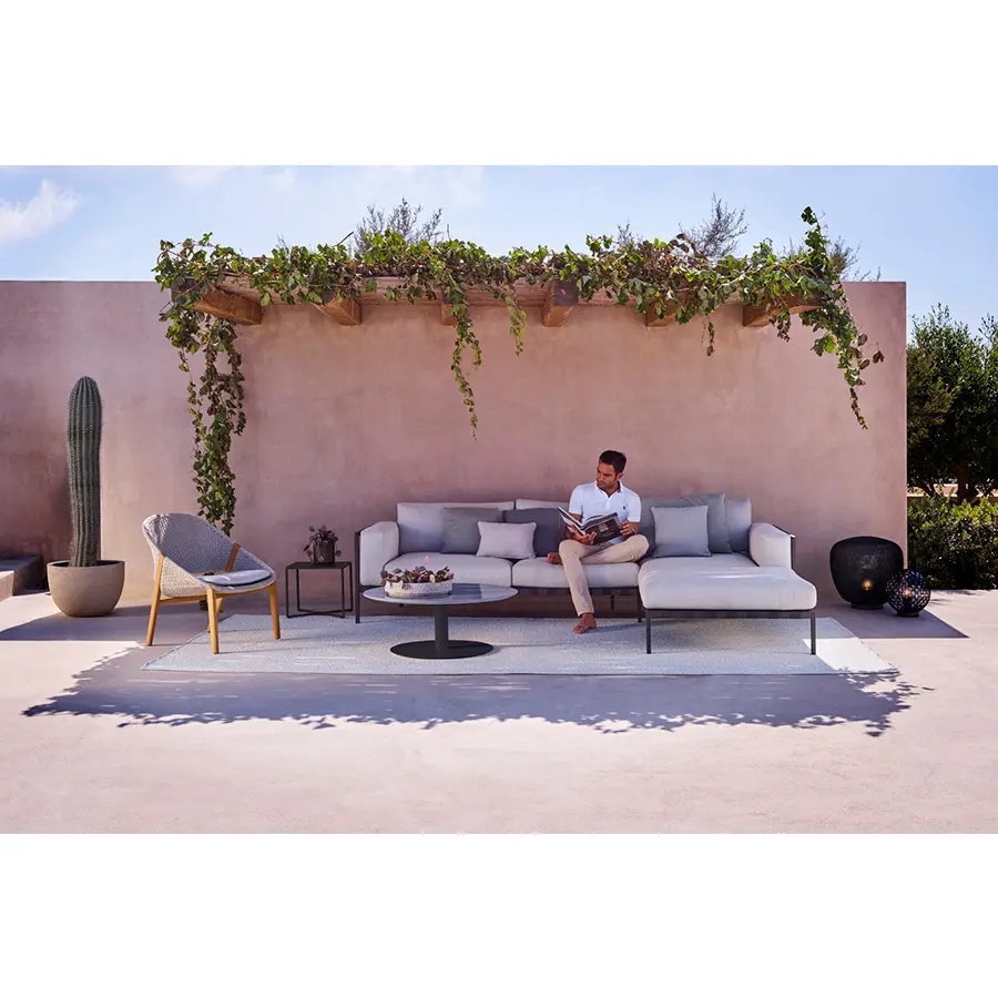 Si a esto le añadimos los dos colores de la estructura y los más de 100 tejidos de exterior disponibles para los cojines, las posibilidades son infinitas. Prestamos especial atención a los cojines de exterior, que se pueden dejar fuera durante toda la temporada de aire libre y que cuentan con un tejido de anchas tiras de textileno.