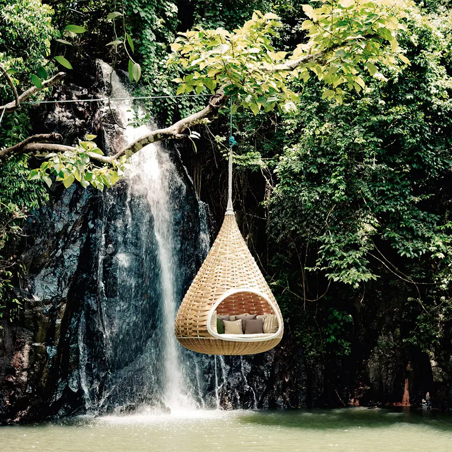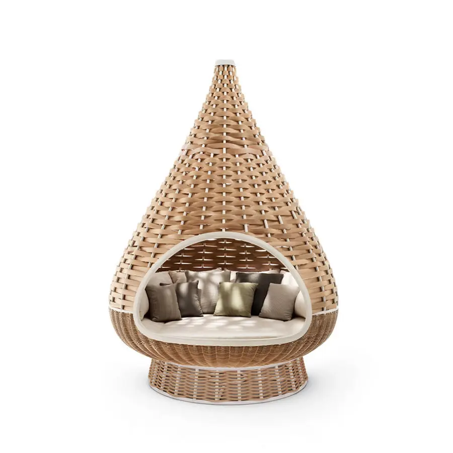 Gracias a su estructura innovadora y orgánica y la sensación de protección y abrigo que destila, el lounger NESTREST se ha establecido como un icono del diseño contemporáneo. Repleto de cojines, su interior es extremadamente cómodo, transpirable y acogedor y su trenzado de fibra especial evita las miradas no deseadas desde el exterior, mientras que desde el interior puede verse el exterior.