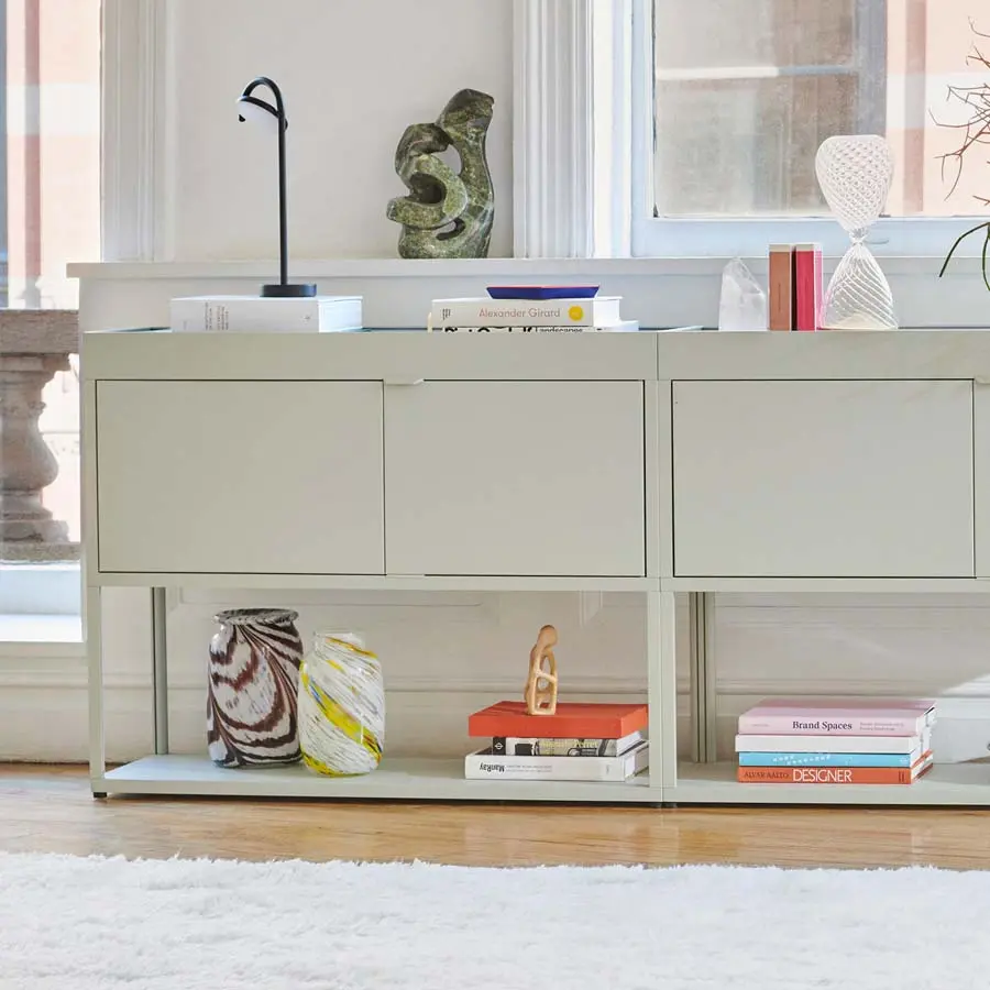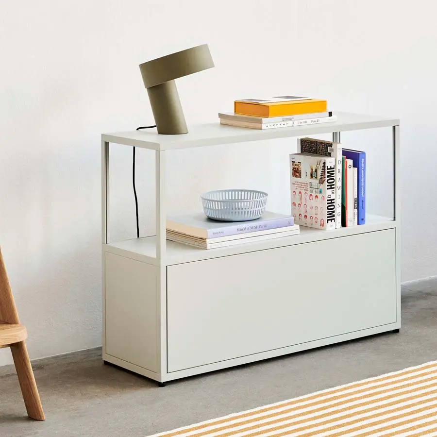 La simple rejilla de New Order y los elementos innovadores que pueden tener hasta 2 metros de largo te permiten construir composiciones aireadas y abiertas o construcciones cerradas con paneles laterales y puertas plegables. Al agregar paneles por todos lados puedes lograr una expresión similar a una pared. La funcionalidad es excepcional, con puertas, paneles traseros y laterales que se pueden enganchar y desenganchar sin el uso de herramientas.