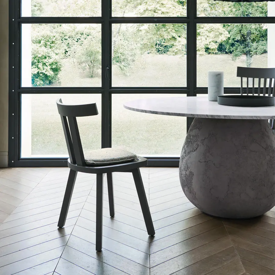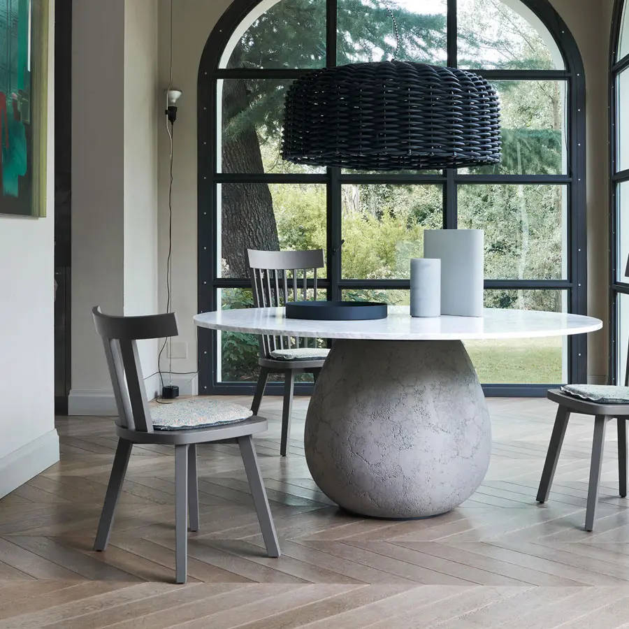 Volúmenes plenos y formas redondeadas caracterizan a la familia de mesas Next 232/236. Disponibles en dos tamaños, resaltan gracias a la escultórica base central de formas plenas, realizada en cemento con acabado craquelado, el tablero, en cambio, es de mármol blanco de Carrara.