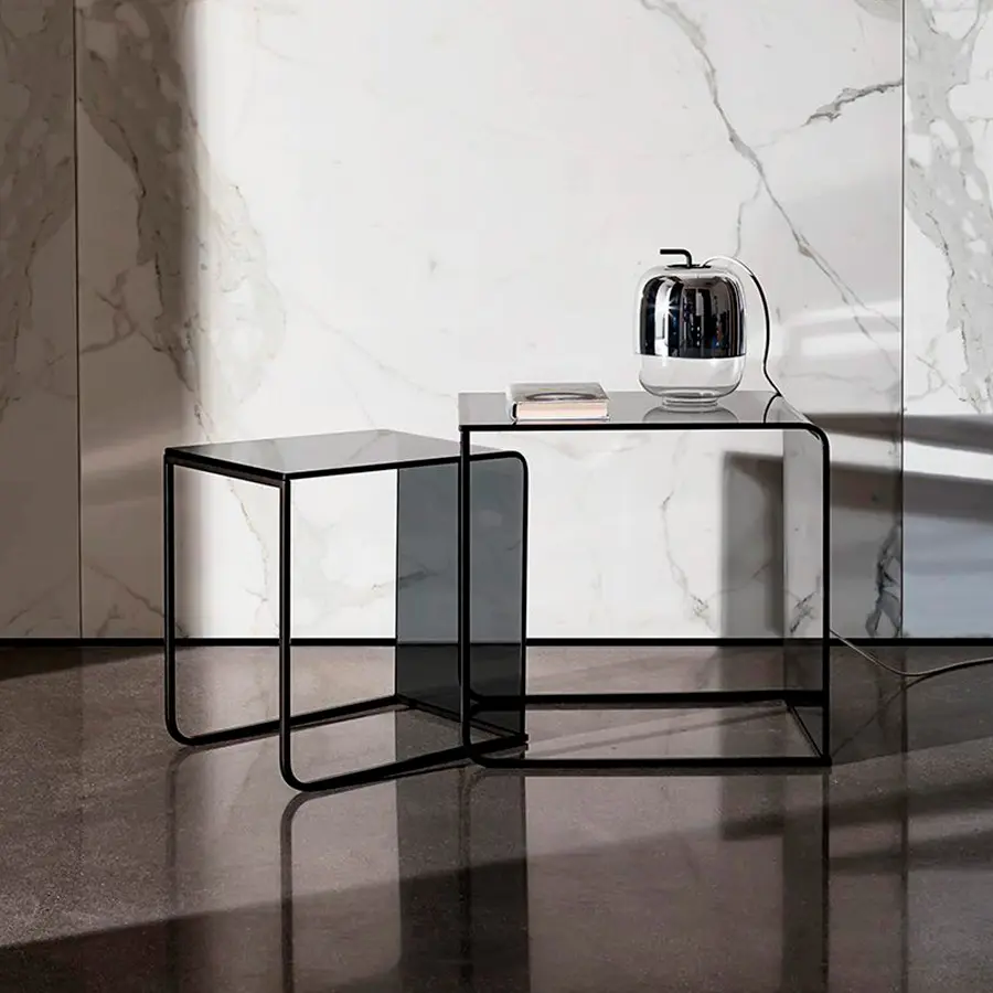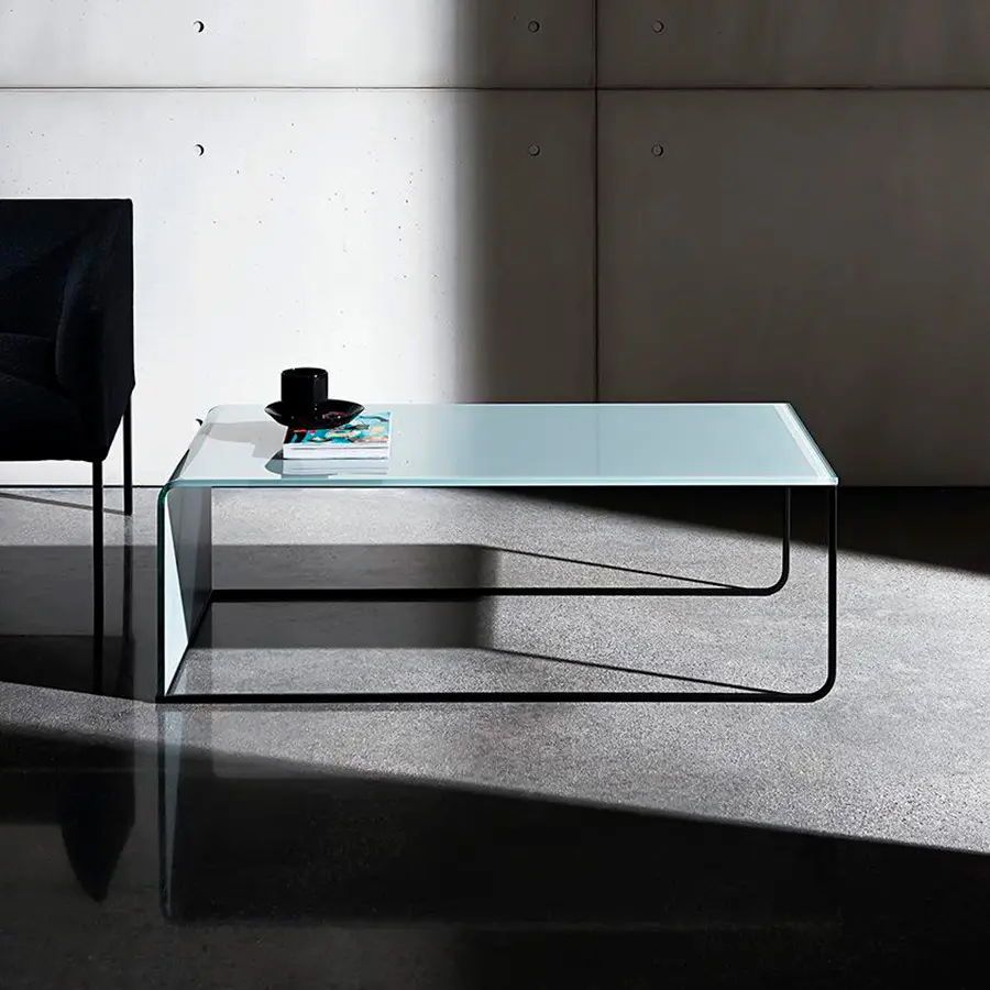 El vidrio curvado y el perfil de metal se unen para crear una sola forma, capaz de crear diferentes combinaciones cromáticas y tipos de muebles: desde mesas auxiliares a consolas. Una idea que puede satisfacer diferentes necesidades con un estilo único.