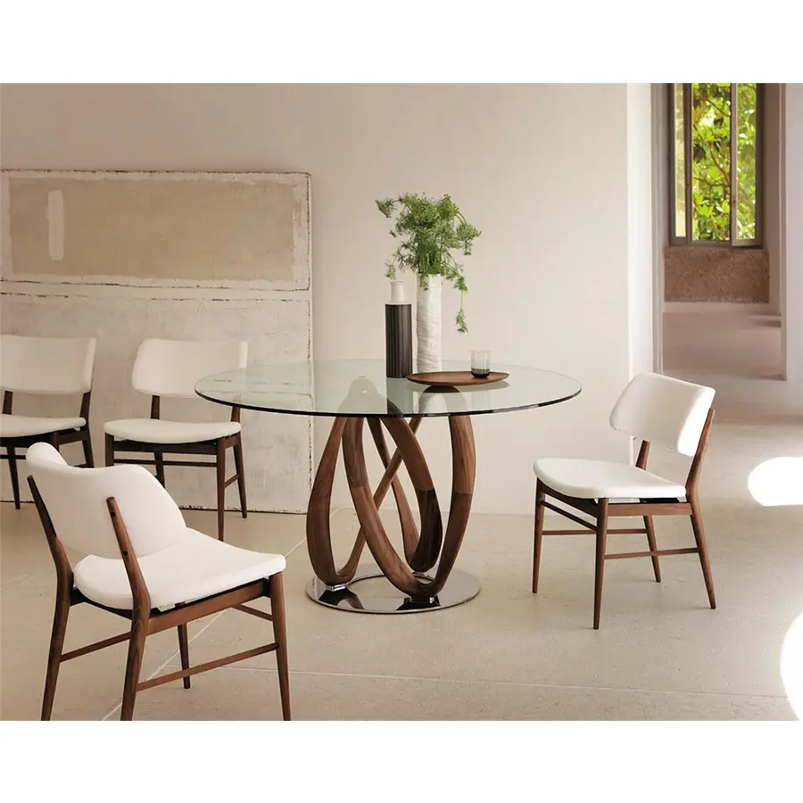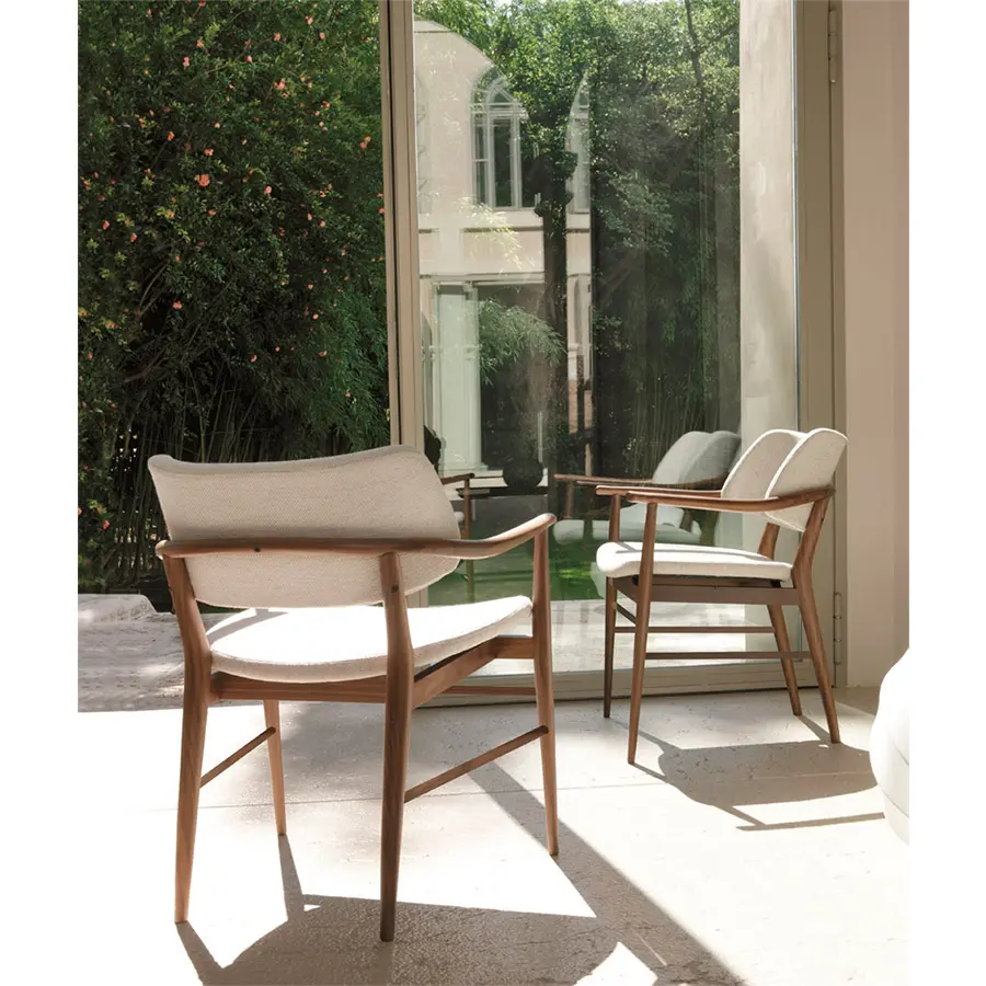 Posibilidad con y sin brazos. Silla muy ligera gracias a su respaldo separado del asiento, pero muy sólida. Estructura en nogal canaletta macizo y revestimiento en las telas de la colección.